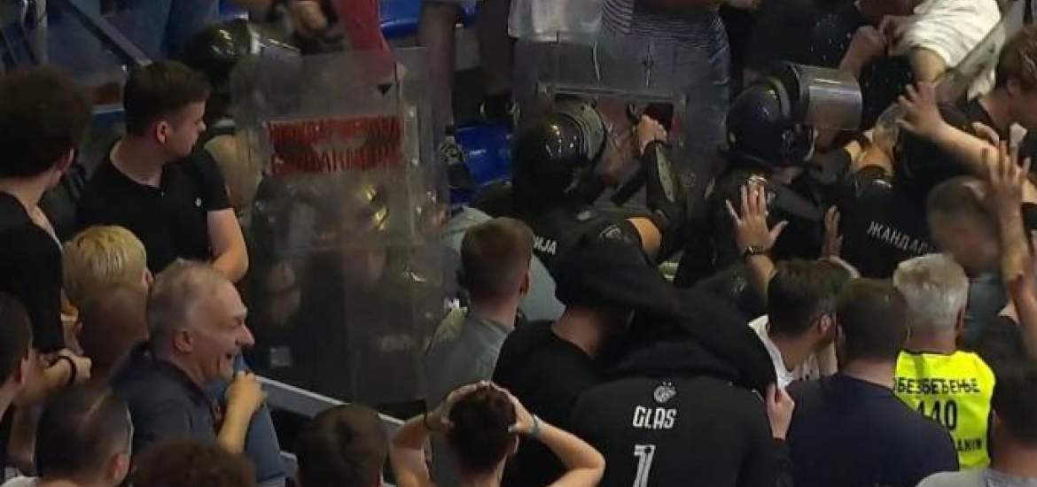 Τα επεισόδια όμως δεν έμειναν εκεί, αφού οι οπαδοί της Παρτιζάν πέταξαν και πάλι αντικείμενα στο παρκέ, χτυπώντας τον έναν από τους τρεις διαιτητές, κάτι που είχε ως αποτέλεσμα να αποχωρήσουν και να διακοπεί ο αγώνας.