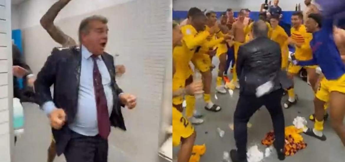 Ο πρόεδρος του κλαμπ, Ζοάν Λαπόρτα, μπήκε στον χορό και άρχισε να τραγουδά Campeones με τους παίκτες των «μπλαουγκράνα», ενώ φυσικά δεν γλίτωσε και το μπουγέλο.