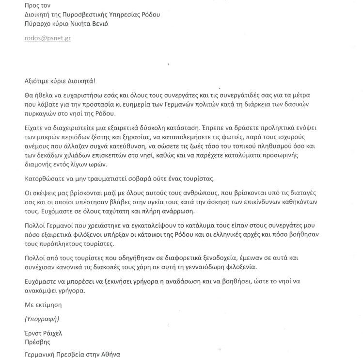 Επιστολή προς τον Διοικητή της Πυροσβεστικής Υπηρεσίας Ρόδου, Πύραρχο κ. Νικήτα Βενιό, έστειλε ο πρέσβης της Γερμανίας στην Ελλάδα, Έρνστ Ράιχελ, προκειμένου να τον ευχαριστήσει για τα μέτρα προστασίας και ευημερίας των Γερμανών τουριστών που λήφθηκαν κατά τη διάρκεια των δασικών πυρκαγιών στη Ρόδο.