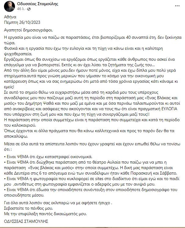 «Είναι ψέμα. Σεβαστείτε το πένθος μου, αφήστε με ήσυχο» – Ο Οδυσσέας Σταμούλης «σπάει» τη σιωπή του (ΦΩΤΟ) 26/10/2023 Ο Οδυσσέας Σταμούλης, λίγο καιρό μετά τον πνιγμό του γιου του στους Φούρνους Ικαρίας, σπάει τη σιωπή του και εξηγεί τα πάντα μέσα από μια ανάρτησή του. Ο ηθοποιός, που βιώνει βαρύ πένθος, εξηγεί με ανάρτησή του στην προσωπική του σελίδα στο Facebook ότι δεν ισχύουν όσα γράφονται για εκείνον περί οικονομικής κατάρρευσης, αλλά ούτε και ότι εξαιτίας του διώχθηκε η παράσταση του Φίλιππου Σοφιανού από το θέατρο Αυλαία. Ο Οδυσσέας Σταμούλης ζητά από όλους να σεβαστούν το πένθος του και εκλιπαρεί να τον αφήσουν στην ησυχία του, στις δύσκολες αυτές μέρες που ζει. Αναλυτικά η ανάρτησή του «Αθήνα Πέμπτη 26/10/2023 Αγαπητοί δημοσιογράφοι, Η εργασία μου είναι να παίζω σε παραστάσεις, έτσι βιοπορίζομαι 40 συναπτά έτη, δεν ξεκίνησα τώρα. Φυσικά και η εργασία που έχω την ευλογία και την τύχη να κάνω είναι και η καλύτερη ψυχοθεραπεία. Εργάζομαι όπως θα συνεχίσω να εργάζομαι όπως εργάζεται κάθε άνθρωπος που ασκεί ένα επάγγελμα για να βιοποριστεί. Εκτός κι αν έχει λύσει τα ζητήματα της ζωής του… Από την άλλη δεν είμαι μόνος μου, δεν ήμουν ποτέ μόνος, είχα και έχω δίπλα μου πολύ γερά στηρίγματα, αυτά προς γνώση μερικών που γέμισαν το κόσμο για την οικονομική μου κατάρρευση όπως και να σας ενημερώσω ότι μετά από τόσα χρόνια εργασίας κάτι κάναμε κι εμείς! Σε αυτό το σημείο θέλω να ευχαριστήσω μέσα από τη καρδιά μου τους υπέροχους συναδέλφους μου που παίζουμε μαζί αυτή τη περίοδο στη παράστασή μας «Ένας Βλάκας και μισός» του Δημήτρη Ψαθά και που μαζί με εμένα και με όσα περνάω ταλαιπωρούνται κι αυτοί από ανακρίβειες και ασάφειες που ακούγονται και να τους πω ότι είναι πραγματική ΕΥΛΟΓΙΑ που υπάρχουν στη ζωή μου και που έχω την τύχη να συνεργάζομαι μαζί τους!! Η παράσταση στην οποία συμμετέχω είναι η παράσταση που συμμετείχα και κατά τη περίοδο του καλοκαιριού. Όπως έρχονται κι άλλα πράγματα που θα κάνω καλλιτεχνικά και προς το παρόν δεν θα τα αποκαλύψω. Μέσα σε όλα αυτά τα απίστευτα λοιπόν που έχουν γραφτεί και έχουν ειπωθεί θέλω να τονίσω ότι: • Eίναι ΨΕΜΑ ότι έχω καταστραφεί οικονομικά. • Είναι ΨΕΜΑ ότι διώχθηκε παράσταση από το θέατρο Αυλαία που παίζω για να μπει η παράσταση «Ένας βλάκας και μισός» στην οποία συμμετέχω. Η δική μας παράσταση είναι κάθε Δευτέρα στις 6 το απόγευμα ενώ των συναδέλφων ήταν κάθε Παρασκευή και Σάββατο. • Είναι ΨΕΜΑ η φωτογραφία που κυκλοφορεί σε sites στο διαδίκτυο ότι είμαι εγώ και το παιδί μου, αντιθέτως στη φωτογραφία εμφανίζεται ο αδερφός μου με τον ανιψιό μου. • Είναι ΨΕΜΑ ότι έδωσα την οποιαδήποτε συνέντευξη στον οποιοδήποτε δημοσιογράφο του οποιουδήποτε μέσου. Για όλα αυτά λοιπόν σας εκλιπαρώ να με αφήσετε ήσυχο . Σεβαστείτε το πένθος μου. Με την επιφύλαξη παντός δικαιώματός μου. ΟΔΥΣΣΕΑΣ ΣΤΑΜΟΥΛΗΣ», έγραψε ο ηθοποιός. ΔΙΑΒΑΣΤΕ ΕΠΙΣΗΣ