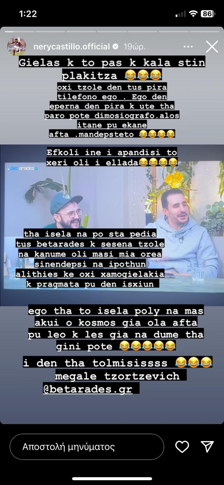 ΒΙΝΤΕΟ & ΦΩΤΟ – Σφοδρή επίθεση Καστίγιο σε Τζόρτζεβιτς: «Ψέμα και στο γέλιο – Εγώ μεγάλε δεν είμαι υποκριτής – Πες μας για τα πέναλτι που έβαζες» 27/11/2023 Ο Νέρι Καστίγιο δεν θέλησε να αφήσει αναπάντητα τα όσα δήλωσε πρόσφατα ο Πρέντραγκ Τζόρτζεβιτς, με αποτέλεσμα να του… επιτεθεί μέσω των social media. Συγκεκριμένα, ο παλαίμαχος Σέρβος ποδοσφαιριστής και θρύλος του Ολυμπιακού παραχώρησε μία συνέντευξη εφ’ όλης της ύλης στους «Betarades», μιλώντας για όλους και για όλα. Μεταξύ άλλων, ο «Τζόλε» αναφέρθηκε στο περιβόητο ντέρμπι της Ριζούπολης, τον Σωκράτη Κόκκαλη, την ΑΕΚ και τον Φώτη Ιωαννίδη. Με αφορμή τα όσα σχολίασε ο πρώην ποδοσφαιριστής των Πειραιωτών, ο Νέρι Καστίγιο θέλησε να πάρει θέση μέσα από τον προσωπικό του λογαριασμό στο Instgram και να εξαπολύσει επίθεση σχετικά με τα όσα ειπώθηκαν για τα στατιστικά, τα γκολ και τις εκτελέσεις πέναλτι. «Γελάς και το πας και καλά στην πλακίτσα. Όχι Τζόλε, δεν τους πήρα τηλέφωνο εγώ. Εγώ δεν έπαιρνα, δεν πήρα και ούτε θα πάρω ποτέ δημοσιογράφο. Άλλος ήταν αυτός που τα έκανε αυτά. Μάντεψε. Εύκολη είναι η απάντηση, το ξέρει όλη η Ελλάδα. Θα ήθελα να πω στα παιδιά τους Betarades και σε εσένα Τζόλε να κάνουμε όλοι μαζί μια ωραία συνέντευξη. Να ειπωθούν αλήθειες και όχι χαμογελάκια και πράγματα που δεν ισχύουν. Εγώ θα το ήθελα πολύ να μας ακούει ο κόσμος για όλα αυτά που λέω και λες. Για να δούμε, θα γίνει ποτέ ή δε θα τολμήσεις. Μεγάλε Τζόρτζεβις», ανέφερε αρχικά. Στη συνέχεια ο Καστίγιο πόσταρε τα στατιστικά με τις συμμετοχές και τα γκολ του Τζόρτζεβιτς και συνέχισε την… επίθεσή του. «Αυτά είναι τα στατιστικά σου μεγάλε Τζόρτζεβιτς στον Ολυμπιακό. Τότε είχαμε πολύ καλύτερη ομάδα απ’ όλους και κάναμε 30 ευκαιρίες. Λογικό να υπήρχαν πέναλτι. Αυτό το λέω για να μην το πάνε αλλού, ότι και καλά παίρναμε πέναλτι μαϊμού. Μέσο όρο τότε εύκολα υπήρχαν δέκα πέναλτι τη χρονιά. Ήρθε ο Ριβάλντο και δεν τον άφησες να βαράει πέναλτι. Παγκόσμιο Κύπελλο πήρε. Σε καταλαβαίνω μεγάλε Τζόρτζεβιτς, ήσουν έξυπνος, τα χρειαζόσουν για να φαίνεται στο τέλος της χρονιάς ότι έχεις 17 γκολ. Ο κόσμος ξεχνάει πώς μπήκαν και λέει 17. Δηλαδή αν μειώνω τα γκολ από πέναλτι που βλέπω, κάθε χρόνο θα είχες 5-6 γκολ. Μεγάλε Τζόρτζεβις νευρίασες και σε ενόχλησε τότε που είχα πει αυτό. Είναι αλήθεια βλέπεις. Εγώ για τα γκολ μίλησα μεγάλε Τζόρτζεβιτς, μην τρελαίνεσαι και με θυμάσαι κάθε φορά που μιλάς. Δεν είπα ότι ήσουν κακό. Παιχταράς ήσουν, απλά είπα πέντε αλήθειες και τρελάθηκες. Γελάω έτσι όπως γελάς κι εσύ. Τουλάχιστον γέλα φυσιολογικά, μην έχεις ψέμα και στο γέλιο, ήμαρτον. Εγώ δεν είπα ποτέ για εσένα ότι δεν έχεις μυαλό ή κάποια ψέματα. Εγώ μίλησα για τα γκολ μόνο και από τότε δε μου ξανά μίλησες. Εγώ δηλαδή δεν έπρεπε να σου μιλάω από τότε με τόσα πράγματα που έχεις βγει και έχεις πει διαφορετικά και λες ψέματα. Εγώ Τζόλε δεν είμαι υποκριτής». ΔΙΑΒΑΣΤΕ ΕΠΙΣΗΣ