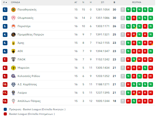 To πανόραμα της Basket League 27/01/2024 Ολοκληρώθηκε το πρώτο μέρος της 16ης αγωνιστικής της Basket League με τον Ολυμπιακό να νικάει εύκολα τον ΠΑΟΚ στο ΣΕΦ. Σάββατο 27/1 Καρδίτσα – ΑΕΚ 86-95 Λαύριο – Προμηθέας 89-84 Περιστέρι – Μαρούσι 95-72 Ολυμπιακός – ΠΑΟΚ 77-62 Κυριακή 28/1 17.15 Άρης – Κολοσσός 20.15 Απόλλων Πατρών – Παναθηναϊκός Η ΒΑΘΜΟΛΟΓΙΑ ΔΙΑΒΑΣΤΕ ΕΠΙΣΗΣ