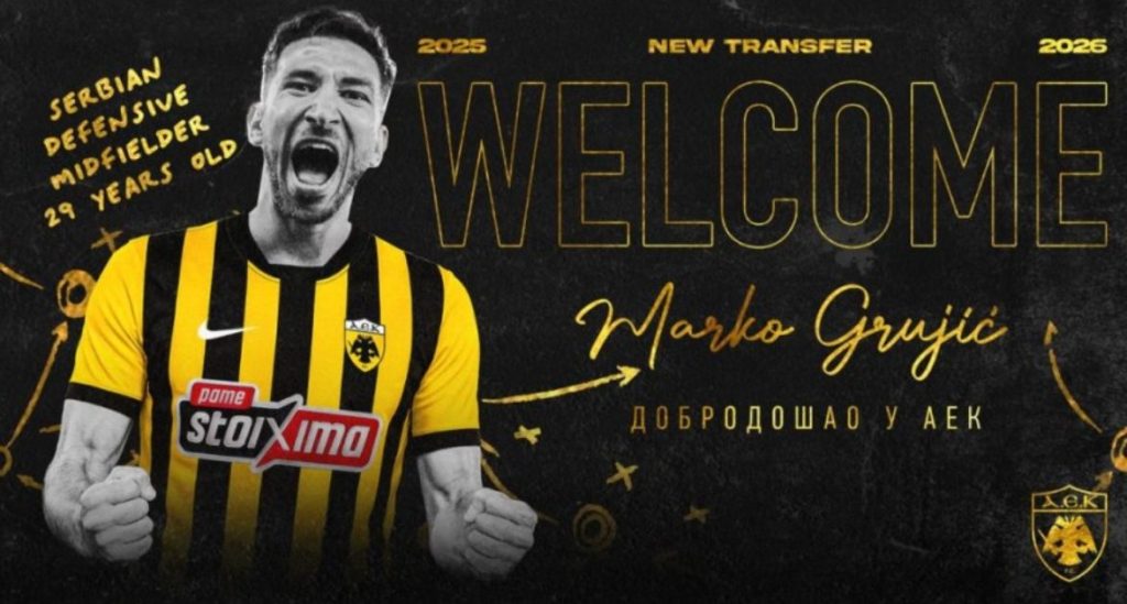 Ανακοίνωσε τον Γκρούγιτς η ΑΕΚ (ΦΩΤΟ) 02/09/2025 Την απόκτηση του Μάρκο Γκρούγιτς ανακοίνωσε η ΑΕΚ, αποκτώντας μια ποιοτική λύση για τη μεσαία γραμμή. Ο 29χρονος χαφ είναι επιλογή του Μάρκο Νίκολιτς, ο οποίος θεωρεί ότι ταιριάζει στο αγωνιστικό πλάνο της ομάδας. Μετά από μια πενταετία στην Πόρτο και θητεία σε Ερυθρό Αστέρα και Λίβερπουλ μεταξύ άλλων, ο Σέρβος θα ενισχύσει τους κιτρινόμαυρους σε Ελλάδα και Ευρώπη. Η ανακοίνωση της ΑΕΚ: “H ΠΑΕ ΑΕΚ ανακοινώνει την απόκτηση του διεθνούς Σέρβου μέσου Μάρκο Γκρούγιτς, ο οποίος την τελευταία πενταετία αγωνιζόταν στη Πόρτο. Ο Μάρκο Γκρούγιτς γεννήθηκε στις 13 Απριλίου του 1996. Ξεκίνησε το ποδόσφαιρο στον Ερυθρό Αστέρα, από τον οποίον μεταπήδησε στη Λίβερπουλ το 2016. Ηταν η πρώτη μεταγραφή της εποχής Κλοπ στον μεγάλο αγγλικό σύλλογο, με τον οποίον ο Γκρούγιτς αγωνίστηκε τη διετία 2016-18. Ακολούθησαν δύο δανεισμοί σε Κάρντιφ (2018) και Χέρτα Βερολίνου (2018-20). Μετά από μια πολύ καλή διετία στην Μπουντεσλίγκα με 54 ματς και 9 γκολ σε όλες τις διοργανώσεις, ο Σέρβος ποδοσφαιριστής προκάλεσε το ενδιαφέρον της Πόρτο, η οποία τον απέκτησε αρχικά με δανεισμό και στη συνέχεια, το καλοκαίρι του 2021, με αγορά. Στα πέντε χρόνια που ανήκε στον πορτογαλικό σύλλογο, ο Γκρούγιτς έπαιξε σε 140 επίσημα ματς και πέτυχε 4 γκολ, έχοντας ενεργή συμμετοχή στο νταμπλ του 2022 και στις κατακτήσεις κυπέλλων το 2023 (Κύπελλο Πορτογαλίας και Λιγκ Καπ) και το 2024 (Κύπελλο Πορτογαλίας). Το νέο απόκτημα της ΑΕΚ είναι εν ενεργεία διεθνής με την Εθνική Σερβίας, στην οποία έχει 28 συμμετοχές, έχοντας συμπεριληφθεί στις αποστολές της στα Παγκόσμια Κύπελλα του 2018 και του 2022. Μάρκο, καλώς ήρθες στην Οικογένεια της ΑΕΚ. Σου ευχόμαστε υγεία και επιτυχίες με την ομαδάρα Μας!”. ΔΙΑΒΑΣΤΕ ΕΠΙΣΗΣ