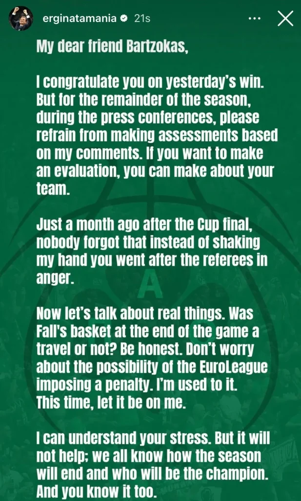 Ο Εργκίν Αταμάν θέλησε να απαντήσει στα λεγόμενα του Γιώργου Μπαρτζώκα στη συνέντευξη Τύπου και αναφέρθηκε μέσω instagram στη διαιτησία του Ολυμπιακός-Παναθηναϊκός.