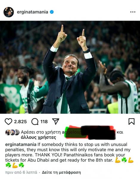 «Απασφάλισε» ο Αταμάν μετά την τιμωρία του Ναν… (ΦΩΤΟ) 11/12/2024 Ο Εργκίν Αταμάν μετά την τιμωρία του Κέντρικ Ναν από την Euroleague έστειλε το μήνυμα προς τον κόσμο του Παναθηναϊκού για το 8ο ευρωπαϊκό. Aναλυτικά η ανάρτησή του: «Αν κάποιος σκεφτεί να μας σταματήσει με ασυνήθιστες ποινές, πρέπει να ξέρει ότι αυτό θα δώσει κίνητρο μόνο εμένα και τους παίκτες μου περισσότερο. ΕΥΧΑΡΙΣΤΩ! Οπαδοί του Παναθηναϊκού κλείστε εισιτήρια για το Άμπου Ντάμπι και ετοιμαστείτε για το 8ο αστέρι». ΔΙΑΒΑΣΤΕ ΕΠΙΣΗΣ