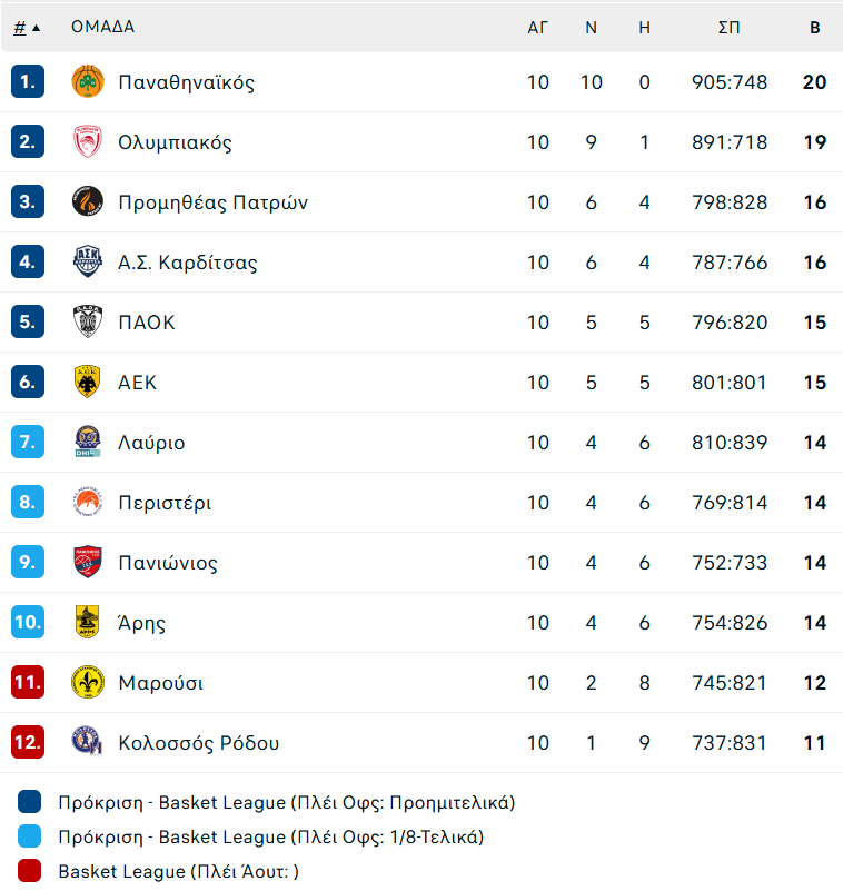 Basket League: Στην Καρδίτσα ο ΠΑΟΚ, φιλοξενεί τον Πανιώνιο ο Προμηθέας, με το Λαύριο η ΑΕΚ (ΦΩΤΟ) 21/12/2024 Η Basket League μπαίνει σήμερα (21/12) στην 11η «στροφή» της, που είναι και η τελευταία για τον πρώτο γύρο, κάτι που σημαίνει πως θα γίνουν γνωστές και κάποιες από τις ομάδες που θα συμμετάσχουν στο Final 8 του Κυπέλλου Ελλάδας ΟΠΑΠ, ενώ τέσσερις ομάδες (Παναθηναϊκός, Ολυμπιακός, Προμηθέας Πάτρας και Καρδίτσα) τα έχουν ήδη καταφέρει. Το σημερινό πρόγραμμα περιλαμβάνει τρεις αγώνες, με τον κάθε ένα να έχει το δικό του διακύβευμα. Αναλυτικά το πρόγραμμα της 11ης αγωνιστικής: Σάββατο 21/12 Καρδίτσα-ΠΑΟΚ (17:00) Προμηθέας-Πανιώνιος (18:00) ΑΕΚ-Λαύριο (20:15) Κυριακή 22/12 Ολυμπιακός-Μαρούσι (14:45) Κολοσσός-Περιστέρι (17:15) Παναθηναϊκός-Άρης (20:15) Η βαθμολογία: ΔΙΑΒΑΣΤΕ ΕΠΙΣΗΣ