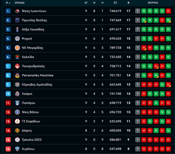 Elite League: Νίκες για Πρωτέα Βούλας, Δόξα Λευκάδας και Βίκο Ιωαννίνων 22/11/2025 Συνεχίζοντας με νίκες, ο Πρωτέας Βούλας, η Δόξα Λευκάδας και ο Βίκος Ιωαννίνων διατηρούν την κορυφή της Elite League μετά την 9η αγωνιστική. Ο Πρωτέας Βούλας επικράτησε με 103-96 στην παράταση επί της Μεγαρίδος, αφού η κανονική διάρκεια είχε ολοκληρωθεί με 90-90. Οι γηπεδούχοι βρέθηκαν να χάνουν με διψήφιες διαφορές στην τρίτη περίοδο, όμως στο τέταρτο δεκάλεπτο και στο έξτρα πεντάλεπτο (13-6) κατάφεραν να πάρουν τη νίκη, φτάνοντας στο 8-1 και παραμένοντας στην κορυφή της βαθμολογίας. Η Δόξα Λευκάδας επιβλήθηκε οριακά εκτός έδρας με 82-80 επί του Λαυρίου και διατηρεί το 8-1, ενώ ο Βίκος Ιωαννίνων επικράτησε εύκολα 90-68 των Σοφάδων και παραμένει επίσης στην κορυφή. Στις υπόλοιπες αναμετρήσεις, το Ψυχικό πανηγύρισε εκτός έδρας νίκη 77-60 επί του Παπάγου, ανεβαίνοντας στο 6-3, ενώ η ΑΓΕ Χαλκίδας διέλυσε τα Τρίκαλα με 87-57, φτάνοντας στην τρίτη σερί νίκη της και βελτιώνοντας το ρεκόρ της σε 5-4. Τέλος, ο Πανερυθραϊκός κέρδισε τον Κόροιβο με 77-70 και οι Μαχητές τη Νίκη Βόλου με 83-73. Τα φύλλα αγώνα: Τρίκαλα – ΑΓΕΧ 57-87 Διαιτητές: Αθανασιάδης-Τζιοπάνος-Μπουγλός Π. (Τέγα) Δεκάλεπτα: 17-19, 27-38, 41-68, 57-87 Τρίκαλα (Κουτσοκέρας): Τζόουνς 19 (6/20 σουτ, 5 ριμπάουντ, 4 ασίστ), Γαζέλας, Αργυρούλης, Τσαφαράς 2, Κολσούζογλου 6, Μπαλός 7 (1/4 τρίποντα, 7 ριμπάουντ), Πηλίτσης 12 (1/7 τρίποντα), Τάταρης 11 (10 ριμπάουντ) ΑΓΕΧ (Σιούτης): Μπράιαντ 24 (4/6 τρίποντα), Παπαρέγκας 4, Μελισσαράτος 10 (1/1 τρίποντο, 10 ριμπάουντ), Γερομιχαλός 12 (2/6 τρίποντα, 8 ασίστ), Μιχαήλ 2, Χάμιλτον 15 (10 ριμπάουντ(, Παΐσιος 1, Νέσης 4, Μητσιμπόνας, Κανονίδης 12 (2/6 τρίποντα, 5 ριμπάουντ, 3 ασίστ), Σταμούλης, Ζερβός 3 (4 ριμπάουντ, 4 ασίστ) Βίκος Ιωαννίνων – Σοφάδες 90-68 Διαιτητές: Νικολαϊδης-Κατωτικίδης-Ντόγκας (Τζαμάκου) Δεκάλεπτα: 26-22, 46-36, 64-54, 90-68 Βίκος Ιωαννίνων (Μιχελάκος): Τζόουνς 8 (2/7 τρίποντα, 3 ασίστ, 4 κλεψίματα), Σιμιτζής 22 (4), Γεωργίου 10 (2), Άντερσον 9 (1), Ντούμας, Γράβας 9 (1), Διαμαντάκος 12, Καμπερίδης 7 (5 ριμπάουντ, 4 ασίστ, 3 κλεψίματα), Βασιλείου, Τσούκας 4 (3 ριμπάουντ, 7 ασίστ), Αρνόκουρος 2, Μαστρογιαννόπουλος 7 (1/3 τρίποντα, 5 ριμπάουντ, 5 ασίστ) Σοφάδες (Κακλαμάνος): Βόιλς 15 (2/6 τρίποντα), Μαυροειδάκος, Χατζής 2, Τουλούπης 9, Πασαγιάννης 5 (1), Σκρίνσκι 8 (2), Επαμεινώνδας 8 (2), Μπουντούρης 10 (2), Σπρίντζιος 4 (1/5 τρίποντα, 5 ριμπάουντ), Καμπερίδης 7 Λαύριο – Δόξα Λευκάδας 80-82 Διαιτητές: Βαγγάλης-Κωνσταντινίδου-Μαλαμάς (Παυλόπουλος) Δεκάλεπτα: 26-29, 46-45, 58-66, 80-82 Λαύριο (Συμεωνίδης): Μακαρατζής 6 (1/2 τρίποντα, 5 ριμπάουντ, 5 ασίστ), Άντερσον 13 (1/2 τρίποντα, 7 ριμπάουντ), Παναγιωτόπουλος 2, Στασινός 6 (0/6 τρίποντα, 8 ασίστ), Σιγάλας 5 (1), Προίσκος 2, Τόλιας 7 (1), Καματερός 16 (4/5 τρίποντα, 6 ριμπάουντ), Καλόγηρος, Ματαλιωτάκης 8, Λεφιού 15 (4/6 τρίποντα) Δόξα Λευκάδας (Τερζής): Κιούσης 3 (1), Ρόμπινσον 17 (1/5 τρίποντα, 7 ριμπάουντ, 5 ασίστ), Άλεν 12 (1/1 τρίποντο, 7 ασίστ), Καλλιακούδας 9 (3), Σαχπατζίδης 18 (4/7 τρίποντα, 8 ριμπάουντ, 2 ασίστ), Σταυρακούκας 11 (2/7 τρίποντα), Χαντζής 3 (1), Φύτρος 5 (1), Τσιμπιράκης, Βισνιέφσκι 4 Παπάγος – Ψυχικό 60-77 Διαιτητές: Λεβεντάκος-Μαγκλογιάννης-Ζακεστίδης (Καλαρέμας) Δεκάλεπτα: 13-23, 31-45, 49-60, 60-77 Παπάγος (Καρακώστας): Μπιλάλης 13 (3/6 τρίποντα, 3 ριμπάουντ, 4 ασίστ, 3 λάθη), Άντερτον 21 (6/15 σουτ, 6 ριμπάουντ, 4 ασίστ), Δενδρινός, Μαλέλης 3 (1), Σκούρτης 3 (1), Αγγελή, Καραμαλέγκος 10 (10 ριμπάουντ), Μπαρμπαγιάννης, Σκοτ 10 Ψυχικό (Ρεμεντέλας): Γκόλαντας 11 (1/4 τρίποντα, 8 ριμπάουντ), Κουκάς 11 (3/9 τρίποντα, 6 ασίστ), Χέντερσον 4 (0/5 τρίποντα), Δήμου 7 (1), Καρράς 6, Γουέ