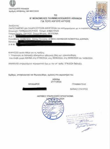 Επίσημο: Εστάλη σε ΕΟΚ, ΕΣΑΚΕ και ΕΛ.ΑΣ. η αθώωση Γιαννακόπουλου (ΦΩΤΟ) 29/11/2024 Οι καταγγελίες των αδελφών Αγγελόπουλων είχαν οδηγήσει στην επιβολή απαγόρευσης εισόδου στα γήπεδα για τον ιδιοκτήτη του Παναθηναϊκού. Ωστόσο, ο Δημήτρης Γιαννακόπουλος ενημέρωσε χθες όλες τις σχετικές αρχές του ελληνικού μπάσκετ πως έχει απαλλαχθεί από τις κατηγορίες που σχετίζονταν με την υπόθεση αυτή. Σήμερα, ο Δημήτρης Γιαννακόπουλος επιστρέφει στο γήπεδο, αφού πρώτα κοινοποίησε την αθωωτική απόφαση του δικαστηρίου στην ΕΟΚ, τον ΕΣΑΚΕ και το αρμόδιο τμήμα της αθλητικής βίας της Ελληνικής Αστυνομίας. Η απόφαση αφορά τις κατηγορίες που είχαν διατυπωθεί από τον Ολυμπιακό. Δείτε το έγγραφο της αθωωτικής απόφασης, όπως αυτό κατατέθηκε στα αρμόδια όργανα: ΔΙΑΒΑΣΤΕ ΕΠΙΣΗΣ
