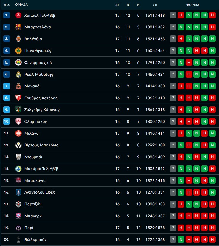 EuroLeague: Η βαθμολογία μετά τη νίκη του Παναθηναϊκού επί της Χάποελ 19/12/2025 Σημαντικό βήμα έκανε ο Παναθηναϊκός με τη νίκη του επί της Χάποελ Τελ Αβίβ, συνεχίζοντας την ανοδική του πορεία στη EuroLeague. Οι «πράσινοι», με στήριξη από τον κόσμο τους στο ΟΑΚΑ, επικράτησαν της πρωτοπόρου. Το αποτέλεσμα αυτό τους επιτρέπει να παραμείνουν σε άμεση επαφή με τις ομάδες που βρίσκονται στις υψηλές θέσεις της βαθμολογίας, ενισχύοντας παράλληλα την αυτοπεποίθησή τους ενόψει της απαιτητικής συνέχειας. Τα αποτελέσματα και το πρόγραμμα 17ης αγωνιστικής: Μακάμπι Τελ Αβίβ – Βαλένθια 85-82 Παναθηναϊκός – Χάποελ Τελ Αβίβ 93-82 Αρμάνι Μιλάνο – Φενέρμπαχτσε 72-87 Ρεάλ Μαδρίτης – Παρί 95-90 Αναντολού Εφές – Ντουμπάι BC 19/12 στις 19:30 Ζαλγκίρις Κάουνας – Παρτιζάν 19/12 στις 20:00 Μονακό – Μπάγερν Μονάχου 19/12 στις 20:30 Ολυμπιακός – Βιλερμπάν 19/12 στις 21:30 Ερυθρός Αστέρας – Βίρτους Μπολόνια 19/12 στις 21:45 Η βαθμολογία: ΔΙΑΒΑΣΤΕ ΕΠΙΣΗΣ