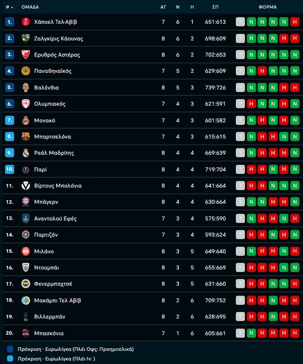 Euroleague: Η βαθμολογία μετά την πρώτη μέρα της 8ης αγωνιστικής 31/10/2025 Η βαθμολογία της Euroleague μετά την πρώτη ημέρα της 8ης αγωνιστικής δείχνει Ζαλγκίρις και Ερυθρό Αστέρα να μοιράζονται την 2η θέση, έχοντας κλείσει ιδανικά τη «διαβολοβδομάδα» με εντυπωσιακές νίκες. Η Ζαλγκίρις έκανε πάρτι απέναντι στη Βιλερμπάν, κάτι που «αντέγραψε» η Ρεάλ κόντρα στη Φενέρ. Ο Ερυθρός Αστέρας επικράτησε της Μακάμπι και έφτασε τις 6 σερί νίκες, ενώ η Μπάγερν γκάζωσε στο δεύτερο ημίχρονο και πήρε τη νίκη απέναντι στην Βίρτους. Η Βαλένθια από την άλλη επικράτησε δύσκολα της Ντουμπάι, ενώ τέλος η Αρμάνι έκανε περίπατο με αντίπαλο την Παρί. Αναλυτικά η 8η αγωνιστική: Πέμπτη 30/10 Ζαλγκίρις-Βιλερμπάν 96-59 Μακάμπι Τελ Αβίβ-Ερυθρός Αστέρας 92-99 Βαλένθια-Ντουμπάι BC 80-78 Αρμάνι Μιλάνο-Παρί 86-77 Μπάγερν Μονάχου-Βίρτους Μπολόνια 86-70 Ρεάλ Μαδρίτης-Φενέρμπαχτσε 84-58 Παρασκευή 31/10 Μονακό-Παναθηναϊκός (20:00) Ολυμπιακός-Χάποελ Τελ Αβίβ (21:15) Μπασκόνια-Αναντολού Εφές (21:30) Παρτιζάν-Μπαρτσελόνα (21:30) Η βαθμολογία ΔΙΑΒΑΣΤΕ ΕΠΙΣΗΣ