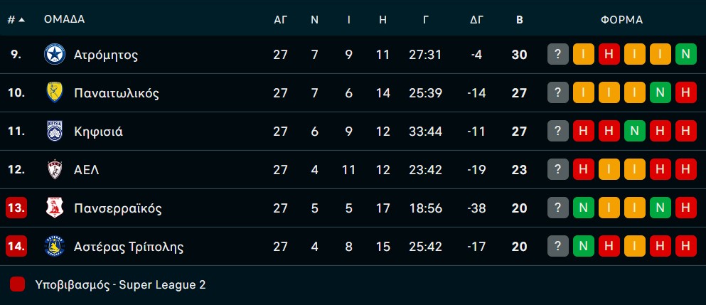 Φουντώνει η μάχη της παραμονής – Η βαθμολογία των playouts (ΦΩΤΟ) 04/04/2026 «Φωτιά» πήρε η μάχη της παραμονής μετά την ολοκλήρωση της 1ης αγωνιστικής των playouts της Super League, με τις ομάδες της επικίνδυνης ζώνης να μπαίνουν δυνατά. Ο Πανσερραϊκός πέρασε με 2-1 από τη Νίκαια απέναντι στην Κηφισιά, με μεγάλο πρωταγωνιστή τον Τσαούση που πέτυχε και τα δύο γκολ για τους Σερραίους. Στη συνέχεια, ο Αστέρας Τρίπολης πήρε σπουδαία νίκη με 3-1 απέναντι στην ΑΕΛ στο «Θεόδωρος Κολοκοτρώνης», με αποτέλεσμα να μειώσει τη διαφορά και να βάλει πίεση στους «βυσσινί», που πλέον βρίσκονται σε δύσκολη θέση. Αστέρας Τρίπολης και Πανσερραϊκός ισοβαθμούν στους 20 βαθμούς και πλησίασαν στους τρεις βαθμούς την ΑΕΛ, η οποία πλέον μπλέκει για τα καλά στη μάχη της παραμονής. Στο Αγρίνιο, ο Ατρόμητος απέσπασε ισοπαλία 1-1 από τον Παναιτωλικό με γκολ στις καθυστερήσεις και διατήρησε την κορυφή της βαθμολογίας με 30 βαθμούς. Ακολουθούν οι Αγρινιώτες, που ισοβαθμούν με την Κηφισιά στους 27 βαθμούς. Τα αποτελέσματα της 1ης αγωνιστικής: Κηφισιά – Πανσερραϊκός 1-2 Αστέρας Τρίπολης – ΑΕΛ 3-1 Παναιτωλικός – Ατρόμητος 1-1 Η βαθμολογία των playouts: Το πρόγραμμα της 2ης αγωνιστικής: ΑΕΛ – Παναιτωλικός (08/04, 16:00) Πανσερραϊκός – Αστέρας Τρίπολης (08/04, 17:00) Ατρόμητος – Κηφισιά (08/04, 19:00) ΔΙΑΒΑΣΤΕ ΕΠΙΣΗΣ