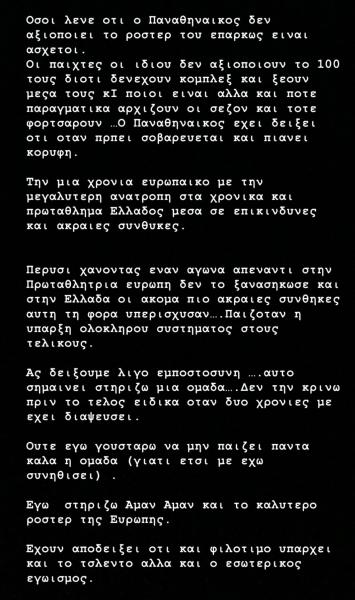 Μεταμεσονύκτια ανάρτηση έκανε ο Δημήτρης Γιαννακόπουλος, κάνοντας αναδρομή στη διετία που πέρασε και εκφράζοντας απόλυτη στήριξη στον προπονητή Αταμάν και τους παίκτες, επισημαίνοντας ότι «έχουν και εγωισμό και φιλότιμο και ταλέντο». Όλα όσα γράφει ο ισχυρός άνδρας του Παναθηναϊκού στην ανάρτησή του στο Instagram: «Όσοι λένε ότι ο Παναθηναϊκός δεν αξιοποιεί επαρκώς το ρόστερ του είναι άσχετοι. Οι παίκτες οι ίδιοι δεν αξιοποιούν το 100% τους διότι δεν έχουν κόμπλεξ και ξέρουν μέσα τους ποιοι είναι αλλά και πότε πραγματικά αρχίζει η σεζόν τότε φορτσάρουν. Ο Παναθηναϊκός έχει δείξει ότι όταν πρέπει σοβαρεύεται και πιάνει κορυφή. Την μία χρονιά ευρωπαϊκό με τη μεγαλύτερη ανατροπή στα χρονικά και πρωτάθλημα Ελλάδος μέσα σε επικίνδυνες και ακραίες συνθήκες. Πέρσι, χάνοντας έναν αγώνα απέναντι στην Πρωταθλήτρια Ευρώπης, δεν το ξανασήκωσε και στην Ελλάδα οι ακόμα πιο ακραίες συνθήκες αυτή τη φορά υπερίσχυσαν… Παιζόταν η ύπαρξη ολόκληρου συστήματος στους τελικούς. Ας δείξουμε λίγο εμπιστοσύνη… αυτό σημαίνει να στηρίζεις μία ομάδα. Δεν την κρίνω πριν το τέλος, ειδικά όταν δύο χρόνιες με έχει διαψεύσει. Ούτε εγώ γουστάρω να μην παίζει πάντα καλά η ομάδα (γιατί έτσι με έχω συνηθίσει). Εγώ στηρίζω Αμαν Αμαν και το καλύτερο ρόστερ της Ευρώπης. Έχουν αποδείξει ότι υπάρχει φιλότιμο, ταλέντο αλλά και εσωτερικός εγωισμός».
