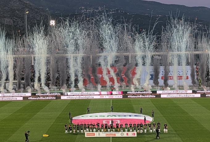 Λίγα λεπτά πριν από τη σέντρα του τελικού κυπέλλου Ελλάδος στο Πανθεσσαλικό, οι ισχυροί άνδρες των δύο συλλόγων εμφανίστηκαν στον αγωνιστικό χώρο και χαιρέτησαν τους ποδοσφαιριστές.