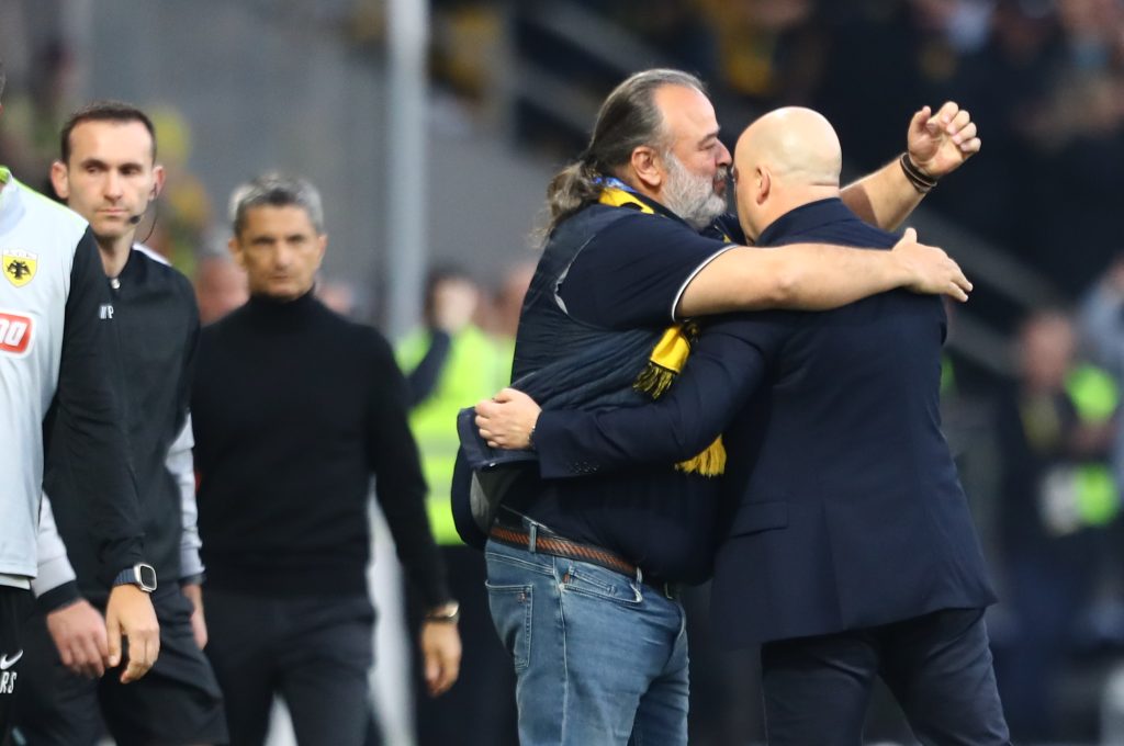 Στο γήπεδο κατέβηκε και ο Μάριος Ηλιόπουλος, ο οποίος αγκάλιασε τον Νίκολιτς και τους ποδοσφαιριστές της ΑΕΚ, συμμετέχοντας στους πανηγυρισμούς της ομάδας μετά τη σημαντική νίκη.