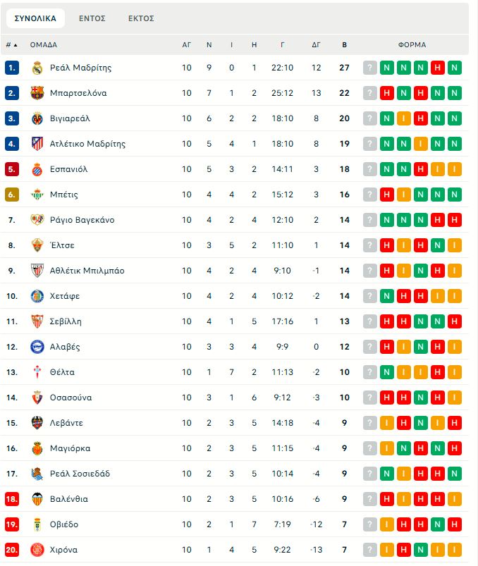 Η Ατλέτικο «καθάρισε» τη Μπέτις και ανέβηκε 4η στη La Liga 28/10/2025 Η Ατλέτικο Μαδρίτης πήρε το «διπλό» στην Ανδαλουσία επί της Μπέτις με σκορ 0-2 και ανέβηκε στην τέταρτη θέση της βαθμολογίας, μετά τη 10η αγωνιστική της La Liga. Οι Μαδριλένοι έφτασαν τους 19 βαθμούς και ξεπέρασαν την Εσπανιόλ (18), ενώ η Μπέτις έμεινε στους 16, στην έκτη θέση. Η Ατλέτικο ξεκίνησε ιδανικά το παιχνίδι και προηγήθηκε μόλις στο 3ο λεπτό με σουτ του Σιμεόνε. Στο 5’ η Μπέτις απείλησε με τον Κούτσο, αλλά το σουτ του έφυγε άουτ. Ο Λόπεθ απέκρουσε δύσκολα το διαγώνιο σουτ του Γκονθάλεθ στο 14’, ενώ στο 27’ ο Όμπλακ είπε «όχι» στον Εζαλζουλί. Στο 45+2’ ο Μπαένα με εντυπωσιακό σουτ έκανε το 0-2 για την Ατλέτικο. Στο δεύτερο ημίχρονο, η Μπέτις είχε μεγάλες ευκαιρίες με τον Λο Σέλσο (52’) και δοκάρι με τον Εζαλζουλί (58’), όμως οι φιλοξενούμενοι αμύνθηκαν σωστά και έφυγαν νικητές από το «Λα Καρτούχα». Μπέτις: Πάου Λόπεθ, Μπεγερίν (69’ Ρουϊμπάλ), Μπάρτρα, Νάταν, Ροντρίγκες (68’ Φίρπο), Άμραμπατ, Άντονι, Ρόκα (46’ Λο Σέλσο), Φορνάλς (76’ Ντεόσα), Εζαλζουλί, Κούτσο Ερνάντες (76’ Μπακαμπού). Ατλέτικο Mαδρίτης: Όμπλακ, Γιορέντε, Χιμένες, Λε Νορμάν, Χάντσκο, Σιμεόνε (81’ Ναχουέλ Μολίνα), Μπάριος (55’ Γκάλαχερ), Κόκε (81’ Αλμάδα), Γκονθάλεθ, Άλβαρες (60’ Σέρλοθ), Μπαένα (60’ Γκριεζμάν) Η βαθμολογία: Tα αποτελέσματα της 10ης αγωνιστικής: Παρασκευή 24/10 Σοσιεδάδ-Σεβίλλη 2-1 (19′, 36′ Ογιαρθάμπαλ – 30′ Γκούντελι) Σάββατο 25/10 Χιρόνα-Οβιέδο 3-3 (64′ πεν, 90′ πεν Στουάνι, 83′ Ουναΐ – 38′ πεν. Βίνας, 57′ Ροντόν, 90’+7′ Κάρμο) Εσπανιόλ-Έλτσε 1-0 (47′ Ρομέρο) Μπιλμπάο-Χετάφε 0-1 (75′ Μαγιοράλ) Βαλένθια-Βιγιαρεάλ 0-2 (45′ πεν. Μορένο, 57΄Κομεσάνα) Κυριακή 26/10 Μαγιόρκα-Λεβάντε 1-1 (79′ Μαφέο – 22′ Εγιόνγκ) Ρεάλ Μαδρίτης-Μπαρτσελόνα 2-1 (22′ Εμπαπέ, 42′ Μπέλιγχαμ – 38′ Φερμίν) Οσασούνα-Θέλτα 2-3 (37′, 45+1′ Μπούντιμιρ – 26′, 69′ Χουτγκλά, 87′ Ντουράν) Ράγιο Βαγιεκάνο-Αλαβές 1-0 (90+1′ Αλεμάο) Δευτέρα 27/10 Μπέτις-Ατλέτικο Mαδρίτης 0-2 (3′ Σιμεόνε, 45+1′ Μπαένα) Η επόμενη (11η) αγωνιστική Παρασκευή 31/10 Χετάφε-Χιρόνα (22:00) Σάββατο 1/11 Βιγιαρεάλ-Ράγιο Βαγιεκάνο (15:00) Ατλέτικο-Σεβίλλη (17:15) Σοσιεδάδ-Μπιλμπάο (19:30) Ρεάλ Μαδρίτης-Βαλένθια (22:00) Κυριακή 2/11 Λεβάντε-Θέλτα (15:00) Αλαβές-Εσπανιόλ (17:15) Μπαρτσελόνα-Έλτσε (19:30) Μπέτις-Μαγιόρκα (22:00) Δευτέρα 3/11 Οβιέδο-Οσασούνα (22:00) ΔΙΑΒΑΣΤΕ ΕΠΙΣΗΣ