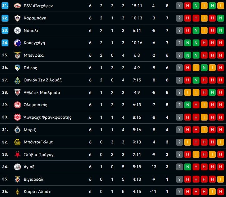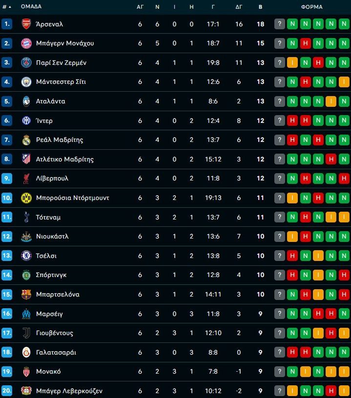 Η βαθμολογία στο Champions League μετά την 6η αγωνιστική 11/12/2025 Η αυλαία της 6ης αγωνιστικής στη League Phase του Champions League ολοκληρώθηκε το βράδυ της Τετάρτης (10/12), διαμορφώνοντας εκ νέου τη συνολική εικόνα της βαθμολογίας και δείχνοντας ξεκάθαρα τη θέση στην οποία βρίσκεται ο Ολυμπιακός στη μάχη για την είσοδο στην 24άδα της διοργάνωσης. Με δύο αγωνιστικές να απομένουν, οι «ερυθρόλευκοι» έχουν συγκεντρώσει 5 βαθμούς, καταλαμβάνοντας την 29η θέση και απέχοντας μόλις δύο βαθμούς από το όριο της 24άδας. Πάνω από τον Ολυμπιακό στη βαθμολογία βρίσκονται κατά σειρά η Αθλέτικ Μπιλμπάο (5β.), η Ουνιόν Σεν Ζιλουάζ (6β.), η Πάφος (6β.), η Μπενφίκα (6β.) και η Κοπεγχάγη, η οποία αυτή τη στιγμή είναι στην 24η θέση. Στην κορυφή παραμένει η Άρσεναλ, η οποία πέρασε εντυπωσιακά από το Βέλγιο με 3-0 απέναντι στην Κλαμπ Μπριζ, συνεχίζοντας την αήττητη και ιδιαίτερα πειστική πορεία της στη διοργάνωση. Μεγάλο διπλό σημείωσε η Μάντσεστερ Σίτι στο «Μπερναμπέου», επί της Ρεάλ Μαδρίτης με 2-1 και μάλιστα με ανατροπή, αποτέλεσμα που την ανέβασε στους 13 βαθμούς και στην 4η θέση. Οι «μερένχες» έμειναν στους 12 βαθμούς και την 8η θέση. Γιουβέντους και Μπενφίκα πανηγύρισαν τη δεύτερη νίκη τους στον θεσμό, παραμένοντας στο κυνήγι της 24άδας. Οι Ιταλοί επικράτησαν με 2-0 της Πάφου στο Τορίνο, ενώ οι Πορτογάλοι υπερίσχυσαν της Νάπολι με το ίδιο σκορ στη Λισαβόνα, μειώνοντας τη μεταξύ τους διαφορά στον έναν βαθμό (7 έναντι 6). Σημαντική ευκαιρία να βρεθεί στην 4η θέση έχασε η Μπορούσια Ντόρτμουντ, η οποία περιορίστηκε στο 2-2 εντός έδρας απέναντι στην Μπόντο Γκλιμτ, μένοντας στους 11 βαθμούς και στη 10η θέση. Ζημιά στην Παρί προκάλεσε η Αθλέτικ Μπιλμπάο, αποσπώντας «λευκή» ισοπαλία σε μια αναμέτρηση που θα μπορούσε να έχει τουλάχιστον 3-4 γκολ, αποτέλεσμα που κρατά τους Βάσκους ζωντανούς στη διεκδίκηση της 24άδας. Η βαθμολογία: Tα αποτελέσματα της 6ης αγωνιστικής: Καϊράτ – Ολυμπιακός 0-1 Μπάγερν – Σπόρτινγκ 3-1 Ίντερ – Λίβερπουλ 0-0 Μπαρτσελόνα – Άιντραχτ 2-1 Αταλάντα – Τσέλσι 2-1 Τότεναμ – Σλάβια Πράγας 3-0 Αϊντχόφεν – Ατλέτικο 2-3 Μονακό – Γαλατάσαραϊ 1-0 Ουνιόν Σεν Ζιλουάζ – Μαρσέιγ 2-3 Βιγιαρεάλ – Κοπεγχάγη 2-3 Καραμπάγκ – Άγιαξ 2-4 Ρεάλ – Μάντσεστερ Σίτι 1-2 Ντόρτμουντ – Μπόντο Γκλιμτ 2-2 Λεβερκούζεν – Νιούκαστλ 1-2 Μπενφίκα – Νάπολι 2-0 Γιουβέντους – Πάφος 2-0 Μπριζ – Άρσεναλ 0-3 Αθλέτικ – Παρί Σεν Ζερμέν 0-0 Το πρόγραμμα της 7ης αγωνιστικής: 20/01 17:30 Καϊράτ – Μπριζ 20/01 19:45 Μπόντο Γκλιμτ – Σίτι 20/01 22:00 Κοπεγχάγη – Νάπολι 20/01 22:00 Ίντερ – Άρσεναλ 20/01 22:00 Ολυμπιακός – Λεβερκούζεν 20/01 22:00 Ρεάλ – Μονακό 20/01 22:00 Σπόρτινγκ – Παρί 20/01 22:00 Τότεναμ – Ντόρτμουντ 20/01 22:00 Βιγιαρεάλ – Άγιαξ 21/01 19:45 Γαλατασαράι – Ατλέτικο 21/01 19:45 Καραμπάγκ – Άιντραχτ 21/01 22:00 Αταλάντα – Αθλέτικ 21/01 22:00 Τσέλσι – Πάφος 21/01 22:00 Μπάγερν – Ουνιόν Σεν Ζιλουάζ 21/01 22:00 Γιουβέντους – Μπενφίκα 21/01 22:00 Νιούκαστλ – Αϊντχόφεν 21/01 22:00 Μαρσέιγ – Λίβερπουλ 21/01 22:00 Σλάβια Πράγας – Μπαρτσελόνα Οι ημερομηνίες και τα αποτελέσματα των αγώνων του Ολυμπιακού: Ολυμπιακός – Πάφος 0-0 Άρσεναλ – Ολυμπιακός 2-0 Μπαρτσελόνα – Ολυμπιακός 6-1 Ολυμπιακός – Αϊντχόφεν 1-1 Ολυμπιακός – Ρεάλ 3-4 Καϊράτ Αλμάτι – Ολυμπιακός 0-1 Τρίτη 20 Ιανουαρίου 2026: Ολυμπιακός – Λεβερκούζεν (22:00) Τετάρτη 28 Ιανουαρίου 2026: Άγιαξ – Ολυμπιακός (22:00) ΔΙΑΒΑΣΤΕ ΕΠΙΣΗΣ