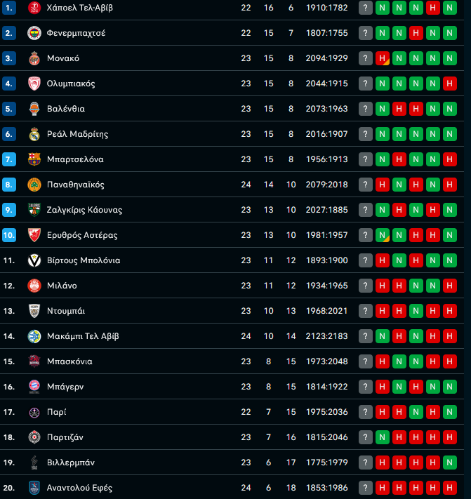 Η βαθμολογία της Euroleague μετά την ήττα του Παναθηναϊκού και τη νίκη του Ολυμπιακού 22/01/2026 Ο Παναθηναϊκός δεν κατάφερε να ξεπεράσει το «εμπόδιο» της Μακάμπι, καθώς οι Πράσινοι ηττήθηκαν εκτός έδρας από τους Ισραηλινούς με 75-71 και υποχώρησαν στο 14-10 και παραμένουν στην 8η θέση. Νωρίτερα, ο Ολυμπιακός επικράτησε της Εφές με 74-68 στην Τουρκία και οι Ερυθρόλευκοι μετά και την αποψινή νίκη φιγουράρουν στην τέταρτη θέση του βαθμολογικού πίνακα της Euroleague, έχοντας ρεκόρ 15-8. Η βαθμολογία ΔΙΑΒΑΣΤΕ ΕΠΙΣΗΣ