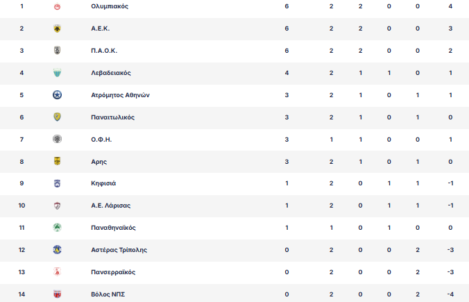 Η βαθμολογία της Super League μετά τη 2η αγωνιστική 01/09/2025 Με νίκες συνέχισαν στη 2η αγωνιστική της Super League ο Ολυμπιακός, ο ΠΑΟΚ και η ΑΕΚ, που επικράτησαν αντίστοιχα απέναντι σε Βόλο, Ατρόμητο και Αστέρα Τρίπολης. Παναθηναϊκός και Άρης από την άλλη γκέλαραν, με τους «πράσινους» να μένουν στο 1-1 με τον Λεβαδειακό στην πρεμιέρα τους, ενώ ο Παναιτωλικός έφυγε με το διπλό από το «Κλεάνθης Βικελίδης». Το πρωτάθλημα διακόπτεται τώρα λόγω των υποχρεώσεων των εθνικών ομάδων και θα επανεκκινήσει το διήμερο 13-14 Σεπτεμβρίου. Τα αποτελέσματα της 2ης αγωνιστικής Σάββατο 30 Αυγούστου Βόλος – Ολυμπιακός 0-2 Πανσερραϊκός – ΟΦΗ 0-1 Άρης – Παναιτωλικός 0-2 ΑΕΛ – Κηφισιά 1-1 Κυριακή 31 Αυγούστου ΑΕΚ – Αστέρας Τρίπολης 1-0 ΠΑΟΚ – Ατρόμητος 1-0 Παναθηναϊκός – Λεβαδειακός 1-1 Η βαθμολογία Η 3η αγωνιστική (13-14 Σεπτεμβρίου) Αστέρας Τρίπολης – ΑΕΛ Ατρόμητος – Άρης Κηφισιά – Παναθηναϊκός Λεβαδειακός – ΑΕΚ ΟΦΗ – ΠΑΟΚ Ολυμπιακός – Πανσερραϊκός Παναιτωλικός – Βόλος *Δεν έχουν οριστεί οι αναμετρήσεις, εξαιτίας της διακοπής. ΔΙΑΒΑΣΤΕ ΕΠΙΣΗΣ