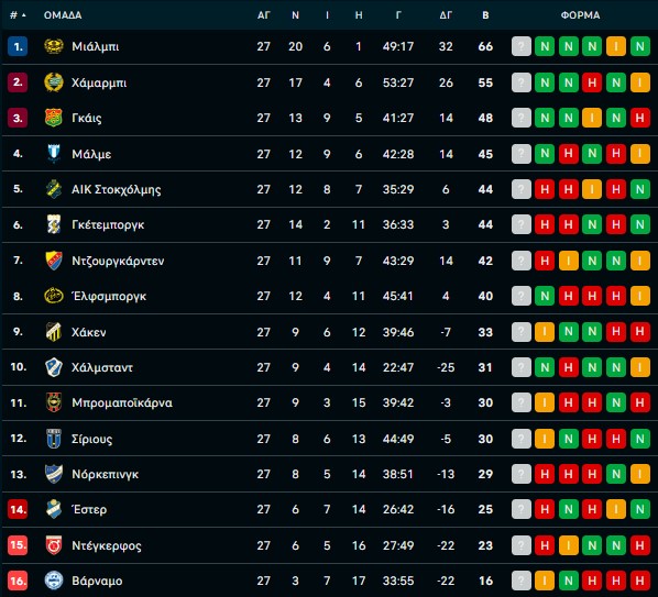 Πρωταθλήτρια Σουηδίας για πρώτη φορά η Μιάλμπι 20/10/2025 Η Μιάλμπι ολοκλήρωσε το ποδοσφαιρικό της έπος στη Σουηδία, κατακτώντας για πρώτη φορά στην ιστορία της το πρωτάθλημα, με τη νίκη 2-0 επί της Γκέτεμποργκ στην 27η αγωνιστική της Αλσβένσκαν. Τρεις αγωνιστικές πριν το φινάλε, η ομάδα του Άντερς Τόστερσον εξασφάλισε μαθηματικά τον τίτλο, δημιουργώντας διαφορά 11 βαθμών από τη δεύτερη Χάμαρμπι. Η επιτυχία αποκτά επικές διαστάσεις, καθώς η ομάδα προέρχεται από το Χάλεβικ, μια πόλη μόλις 1.500 κατοίκων και διαθέτει ρόστερ με αξία περίπου στο 15% αυτού της παραδοσιακής πρωταθλήτριας Μάλμε. Το επίτευγμα αποκτά ακόμη μεγαλύτερη σημασία αν αναλογιστεί κανείς ότι πριν λίγα χρόνια η Μιάλμπι είχε φτάσει μέχρι και την τρίτη κατηγορία της χώρας. Σημαντικό ρόλο στην πορεία προς τον τίτλο είχε ο Αμπντουλί Μανέ, ο οποίος αγωνίστηκε βασικός στον κρίσιμο αγώνα με τη Γκέτεμποργκ. Ο Σενεγαλέζος είχε βρεθεί κοντά σε μεταγραφή στον Ολυμπιακό, η οποία όμως δεν ολοκληρώθηκε την τελευταία στιγμή. Οι άνθρωποι της Μιάλμπι πανηγύρισαν με την ψυχή τους αυτή την ιστορική και ανεπανάληπτη επιτυχία. Les images du sacre HISTORIQUE de Mjällby en Allsvenskan !🇸🇪 Parfois les images valent plus que des mots. Bravo !👏 pic.twitter.com/39SEeuF0lk — Nordisk Football (@NordiskFootball) October 20, 2025 Η βαθμολογία: Πρωταθλήτριες Σουηδίας Μάλμε — 24 πρωταθλήματα Γκέτεμποργκ — 18 πρωταθλήματα Νόρκεπινγκ — 13 πρωταθλήματα AIK Στοκχόλμης — 12 πρωταθλήματα Τζουργκάρντεν — 12 πρωταθλήματα Έργκριτε — 12 πρωταθλήματα Έλφσμποργκ — 6 πρωταθλήματα Χέλσινγκμποργκ — 5 πρωταθλήματα Γκάις — 4 πρωταθλήματα Έστερ — 4 πρωταθλήματα Χάλμσταντ — 4 πρωταθλήματα Οτβίνταμπεργκ — 2 πρωταθλήματα Μιάλμπι — 1 πρωτάθλημα Σλάιπνερ — 1 πρωτάθλημα Χάμαρμπι — 1 πρωτάθλημα Έσκιλστουνα — 1 πρωτάθλημα Κάλμαρ — 1 πρωτάθλημα Γκέτεμποργκς ΙΦ — 1 πρωτάθλημα Φέσμπεργκς ΙΦ — 1 πρωτάθλημα Μπρύνες ΙΦ — 1 πρωτάθλημα Χάκεν — 1 πρωτάθλημα ΔΙΑΒΑΣΤΕ ΕΠΙΣΗΣ