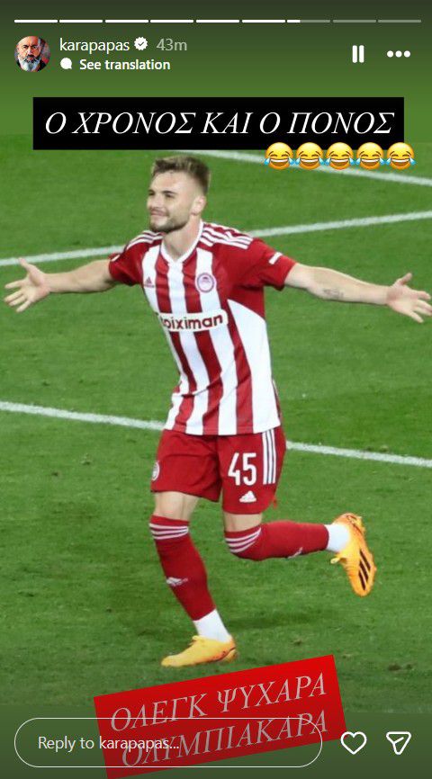 Καραπαπάς για Αλαφούζο: «Ο πιο αποτυχημένος πρόεδρος όλων των εποχών» (ΦΩΤΟ) 16/11/2025 Ο Γιάννης Αλαφούζος παραχώρησε εκτενή συνέντευξη Τύπου, κατά την οποία αναφέρθηκε και στον Ολυμπιακό. Στις δηλώσεις του απάντησε ο αντιπρόεδρος της ΠΑΕ Ολυμπιακός, Κώστας Καραπαπάς, με αναρτήσεις που έφεραν τον δικό τους σχολιασμό. Ο ισχυρός άνδρας των Πειραιωτών ανέβασε αρχικά φωτογραφία του Όλεγκ Ρέαμπτσουκ και τον πανηγυρισμό του στο Ολυμπιακός – Παναθηναϊκός, συνοδεύοντάς τη με τη λεζάντα: «Ο χρόνος και ο πόνος. Όλεγκ ψυχάρα Ολυμπιακάρα». Στη συνέχεια ανάρτησε εικόνα με τον Χουάνκαρ, γράφοντας: «”Ο Ολυμπιακός δεν πιστεύει στο Fair Play” είπε ο Γιάννης Αλαφούζος! Ο άνθρωπος που φοβάται να πάει στο γήπεδο της ομάδας του! Ο πιο αποτυχημένος πρόεδρος όλων των εποχών σε όλα τα σπορ (και να μείνει εκεί πάντα ευχόμαστε). Ακούς Χουάνκαρ; Ή δεν ακούς ακόμα; Θα μας μάθετε fair play εσείς και τέτοιες μέρες να μιλήσουμε για fair play τύπου Χουντέμπλεϊ δεν θέλουμε». Τέλος, στην τρίτη φωτογραφία εμφανιζόταν ο Βασίλης Καΐλας, συνοδευόμενη από τη φράση: «Σπάραξε η καρδιά μας». Δείτε τα story που έκανε ο Κώστας Καραπαπάς: ΔΙΑΒΑΣΤΕ ΕΠΙΣΗΣ