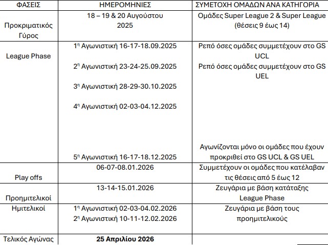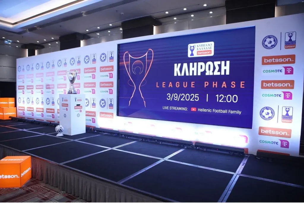 Κύπελλο Ελλάδας: Με Άρης-ΠΑΟΚ τα ζευγάρια της League Phase! (ΦΩΤΟ) 03/09/2025 Με νέα μορφή διεξάγεται φέτος το Κύπελλο Ελλάδας και σήμερα διενεργήθηκε η κλήρωση της League Phase. Πριν ξεκινήσει η διαδικασία της κλήρωσης, τον λόγο πήρε ο πρόεδρος της ΕΠΟ, Μάκης Γκαγκάτσης, ο οποίος αναφέρθηκε στο νέο φορμάτ του Κυπέλλου. Παράλληλα, αποκάλυψε ότι στόχος είναι να υπάρχουν Έλληνες διαιτητές στα παιχνίδια Κυπέλλου και ξένοι στο VAR προκειμένου, να διαιτητεύσουν οι Έλληνες κάποια ματς μεταξύ μεγάλων ομάδων. Ακόμα αναφέρθηκε στην υποχρεωτική από φέτος συμμετοχή ενός Έλληνα παίκτη στην ενδεκάδα, καθ’ όλη τη διάρκεια του αγώνα. Οι περιορισμοί που μπήκαν στη διαδικασία είναι ότι Ελλάς Σύρου και Καβάλα θα παίξουν εκτός έδρας την 1η αγωνιστική. Λόγω των ευρωπαϊκών διοργανώσεων, ο Ολυμπιακός δεν θα παίξει την πρώτη αγωνιστική, ΠΑΟΚ, Παναθηναϊκός δεν θα αγωνιστούν στη 2η. Μόνο τα ματς των Ολυμπιακού, ΠΑΟΚ και Παναθηναϊκού θα διεξαχθούν την 5η αγωνιστική. Αναλυτικά το πρόγραμμα: 1η αγωνιστική (16-17-18/9) Ατρόμητος-Ελλάς Σύρου Ηλιούπολη-Βόλος Κηφισιά-Αστέρας Τρίπολης Λεβαδειακός-ΠΑΟΚ Μαρκό-ΑΕΛ ΟΦΗ-Καβάλα Παναθηναϊκός-Καλλιθέα Παναιτωλικός-Άρης Αιγάλεω-ΑΕΚ 2η αγωνιστική (23-24-25/9) ΑΕΚ-Παναιτωλικός ΑΕΛ-Λεβαδειακός Αστέρας Τρίπολης-Ολυμπιακός Καλλιθέα-ΟΦΗ Άρης-Μαρκό Βόλος-Ατρόμητος Ελλάς Σύρου-Αιγάλεω Καβάλα-Κηφισιά Ηρακλής-Ηλιούπολη 3η αγωνιστική (28-29-30/10) Ατρόμητος-Παναθηναϊκός Ηλιούπολη-ΑΕΚ Κηφισιά-Καλλιθέα Λεβαδειακός-Αστέρας Τρίπολης Ολυμπιακός-Βόλος ΟΦΗ-Ηρακλής Παναιτωλικός-Ελλάς Σύρου ΠΑΟΚ-ΑΕΛ Αιγάλεω-Άρης 4η αγωνιστική (2-3-4/12) ΑΕΚ-ΟΦΗ ΑΕΛ-Ατρόμητος Αστέρας Τρίπολης-Ηλιούπολη Καλλιθέα-Καβάλα Άρης-ΠΑΟΚ Βόλος-Αιγάλεω Ελλάς Σύρου-Ολυμπιακός Μαρκό-Λεβαδειακός Ηρακλής-Παναιτωλικός Παναθηναϊκός-Κηφισιά 5η αγωνιστική (16-17-18/12) Καβάλα-Παναθηναϊκός Ολυμπιακός-Ηρακλής ΠΑΟΚ-Μαρκό Τα αποτελέσματα των αγώνων της League Phase θα υπολογίζονται σε ενιαίο βαθμολογικό πίνακα και ο συνολικός πίνακας με τη βαθμολογία των 20 ομάδων για τη League Phase θα προσδιορίσει ποιες ομάδες θα προκριθούν απευθείας στην προημιτελική φάση και ποιες ομάδες θα συμμετέχουν στα playoffs. Στους προημιτελικούς συμμετέχουν 8 ομάδες: Oι νικητές των ζευγαριών της φάσης των playoffs και οι ομάδες που κατέλαβαν τις θέσεις από 1 έως 4 της βαθμολογικής κατάταξης στη League Phase. Τα τέσσερα ζευγάρια των προημιτελικών που θα προκύψουν: 1ος προημιτελικός: O 1ος της βαθμολογικής κατάταξης της League Phase με τον νικητή του 4ου ζευγαριού (8ος με 9ο). 2ος προημιτελικός: Ο 2ος της βαθμολογικής κατάταξης στη League Phase με τον νικητή του 3ου ζευγαριού (7ος με 10ο). 3ος προημιτελικός: Ο 3ος της βαθμολογικής κατάταξης στη League Phase με τον νικητή του 2ου ζευγαριού (6ος με 11ο). 4ος προημιτελικός: Ο 4ος της βαθμολογικής κατάταξης στη League Phase με τον νικητή του 1ου ζευγαριού (5ος με 12ο). Οι αγώνες θα είναι μονοί και γηπεδούχος θα είναι η ομάδα που βρίσκεται πιο ψηλά στη βαθμολογική κατάταξη της League Phase, εν προκειμένω ο 1ος, ο 2ος, ο 3ος και ο 4ος. Στα ημιτελικά συμμετέχουν οι νικητές των ζευγαριών των προημιτελικών. Τα ζευγάρια που θα προκύψουν στους δύο ημιτελικούς: 1ος ημιτελικός: O νικητής του 1ου προημιτελικού με τον νικητή του 4ου προημιτελικού. 2ος ημιτελικός: O νικητής του 2ου προημιτελικού με τον νικητή του 3ου προημιτελικού. Οι αγώνες θα είναι διπλοί και οι δεύτεροι αγώνες θα διεξαχθούν στις έδρες των ομάδων που προκρίθηκαν από τον 1ο και 2ο προημιτελικό αγώνα, στον οποίον συμμε