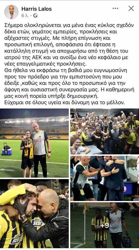 Ο Χάρης Λάλος αποχώρησε από την ΑΕΚ (ΦΩΤΟ) 17/11/2025 Ο Χάρης Λάλος, μέλος του ιατρικού επιτελείου της ΑΕΚ, ανακοίνωσε μέσω των social media την αποχώρησή του από την ομάδα μετά από περίπου δέκα χρόνια προσφοράς. Συγκεκριμένα, ο Λάλος ευχαρίστησε άπαντες στην «κιτρινόμαυρη» ΠΑΕ για την κοινή πορεία του και ανέφερε: «Σήμερα ολοκληρώνεται για μένα ένας κύκλος σχεδόν δέκα ετών, γεμάτος εμπειρίες, προκλήσεις και αξέχαστες στιγμές. Με πλήρη επίγνωση και προσωπική επιλογή, αποφάσισα ότι έφτασε η κατάλληλη στιγμή να αποχωρήσω από τη θέση του ιατρού της ΑΕΚ και να ανοίξω ένα νέο κεφάλαιο με νέες επαγγελματικές προκλήσεις. Θα ήθελα να εκφράσω τη βαθιά μου ευγνωμοσύνη προς τον πρόεδρο για την εμπιστοσύνη που μου έδειξε, καθώς και προς όλο το προσωπικό για την άψογη και ουσιαστική συνεργασία μας. Η καθημερινή μας κοινή πορεία υπήρξε δημιουργική. Εύχομαι σε όλους υγεία και δύναμη για το μέλλον». ΔΙΑΒΑΣΤΕ ΕΠΙΣΗΣ