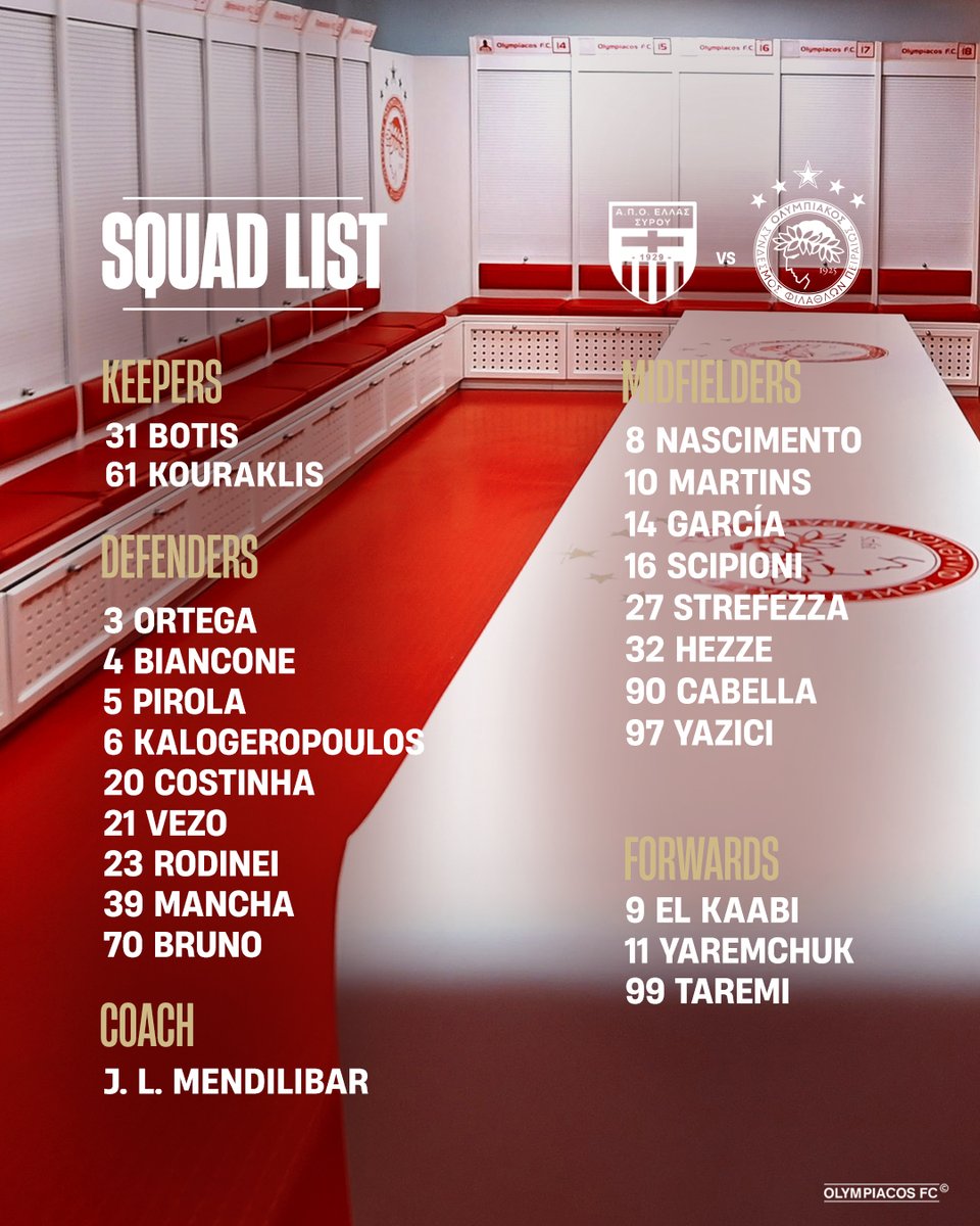 Ολυμπιακός: Με Ταρέμι και αρκετές απουσίες στη Σύρο για το ματς Κυπέλλου (ΦΩΤΟ) 02/12/2025 Ο Ολυμπιακός ολοκλήρωσε την προετοιμασία του για το εκτός έδρας παιχνίδι με την Ελλάς Σύρου, που θα γίνει την Τετάρτη (3/12, 13:30) στην πρωτεύουσα των Κυκλάδων, για την 4η αγωνιστική του Κυπέλλου Ελλάδας. Μετά το τέλος της προπόνησης, ο προπονητής του Ολυμπιακού, Χοσέ Λουίς Μεντιλίμπαρ, ανακοίνωσε την αποστολή των νταμπλούχων Ελλάδας για τη Σύρο. Εκτός αυτής είναι φυσικά οι τραυματίες Ρέτσος, Τσικίνιο, Ποντένσε και Πασχαλάκης, όπως και ο Τζολάκης. Την ομάδα στη Σύρο δεν θα ακολουθήσει ούτε ο Μουζακίτης, ο οποίος βρέθηκε τη Δευτέρα (1/12) στην Ιταλία για να πάρει το βραβείο Golden Boy Web. Η αποστολή του Ολυμπιακού αποτελείται από τους εξής ποδοσφαιριστές: Μπιανκόν, Μπότης, Μπρούνο, Καμπελά, Κοστίνια, Έσε, Καλογερόπουλος, Κουράκλης, Γκαρθία, Μάνσα, Ελ Κααμπί, Νασιμέντο, Ορτέγκα, Πιρόλα, Μαρτίνς, Ροντινέι, Σιπιόνι, Στρεφέτσα, Ταρέμι, Βέζο, Γιάρεμτσουκ, Γιαζίτζι. ΔΙΑΒΑΣΤΕ ΕΠΙΣΗΣ