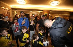 Οι παίκτες της ΑΕΚ έβγαλαν δεκάδες φωτογραφίες με τους οπαδούς και υπέγραψαν αυτόγραφα στους μικρούς φίλους του Δικέφαλου, οι οποίοι είχαν συγκεντρωθεί στο ξενοδοχείο.