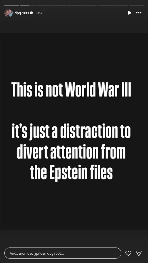 Συγκεκριμένα, έγραψε: «Δεν είναι Γ’ Παγκόσμιος Πόλεμος. Είναι απλώς μια απόσπαση της προσοχής από τα αρχεία Επστάιν».