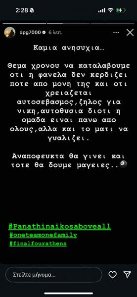 Παρέμβαση Γιαννακόπουλου για την εικόνα του Παναθηναϊκού (ΦΩΤΟ) 01/11/2025 Ο Παναθηναϊκός δεν πραγματοποίησε καλή εμφάνιση στο Πριγκιπάτο και μοιραία ηττήθηκε με 92-84 από τη Μονακό. Ωστόσο, ο Δημήτρης Γιαννακόπουλος εμφανίστηκε καθησυχαστικός. Με διαδικτυακή του ανάρτηση, ο διοικητικός επικεφαλής των πρασίνων θέλησε να ηρεμήσει τα πνεύματα, ενώ προέβλεψε μεγάλη αγωνιστική άνοδο της ομάδας, γράφοντας τα εξής: «Καμία ανησυχία… Θέμα χρόνου να καταλάβουμε ότι η φανέλα δεν κερδίζει ποτέ από μόνη της και ότι χρειάζεται αυτοσεβασμός, ζήλος για νίκη, αυτοθυσία διότι η ομάδα είναι πάνω απ’ όλους, αλλά και το μάτι να γυαλίζει. Αναπόφευκτα θα γίνει και τότε θα δούμε μαγείες…». ΔΙΑΒΑΣΤΕ ΕΠΙΣΗΣ