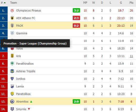 Η βαθμολογία της Super League 1, πάτησε… γκάζι ο Ολυμπιακός 21/11/2021 Μετά από ένα υπέροχο ντέρμπι, ο Ολυμπιακός πανηγύρισε μια μεγάλη νίκη με σκορ 3-2 επί της ΑΕΚ στο ΟΑΚΑ και σε συνδυασμό και με την ήττα του ΠΑΟΚ στο Περιστέρι (2-0), χάθηκε στη βαθμολογία! Οι «ερυθρόλευκοι» βρίσκονται, πλέον, στο +6 και στο +7 αντίστοιχα από τους δύο «δικέφαλους»! Από εκεί και πέρα, η πρώτη νίκη του Ατρόμητου στη σεζόν είναι τεράστια ανάσα, με τους Περιστεριώτες να «πιάνουν» τον Απόλλωνα Σμύρνης, που ηττήθηκε με 1-0 στο Αγρίνιο από τον Παναιτωλικό. Δείτε τη βαθμολογία: ΔΙΑΒΑΣΤΕ ΕΠΙΣΗΣ
