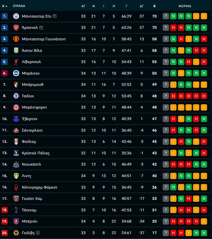 Premier League: Χέρι-χέρι Σίτι και Άρσεναλ – Η βαθμολογία και πρόγραμμα μέχρι το φινάλε (ΦΩΤΟ) 23/04/2026 Στην τελική ευθεία μπαίνει η «μάχη» του τίτλου στην Premier League, με Μάντσεστερ Σίτι και Άρσεναλ να συνεχίζουν χέρι-χέρι στην κορυφή μετά τη νίκη των «πολιτών» επί της Μπέρνλι. Η Σίτι έφτασε τους 70 βαθμούς, όσους έχει και η Άρσεναλ, ωστόσο βρίσκεται στην πρώτη θέση λόγω καλύτερης επίθεσης, καθώς οι δύο ομάδες έχουν και την ίδια διαφορά τερμάτων (+37). Με πέντε αγωνιστικές να απομένουν, το πρόγραμμα αναμένεται να παίξει καθοριστικό ρόλο, με την Άρσεναλ να έχει – τουλάχιστον θεωρητικά – πιο απαιτητικό δρόμο μέχρι το φινάλε. Η βαθμολογία: Τα εναπομείναντα παιχνίδια της Μάντσεστερ Σίτι: 04/05 Έβερτον-Μάντσεστερ Σίτι 09/05 Μάντσεστερ Σίτι-Μπρέντφορντ 17/05 Μπόρνμουθ-Μάντσεστερ Σίτι 22/05 Μάντσεστερ Σίτι-Κρίσταλ Πάλας 24/05 Μάντσεστερ Σίτι-Άστον Βίλα Τα εναπομείναντα παιχνίδια της Άρσεναλ: 25/04 Άρσεναλ-Νιούκαστλ 02/05 Άρσεναλ-Φούλαμ 10/05 Γουέστ Χαμ-Άρσεναλ 17/05 Άρσεναλ-Μπέρνλι 24/05 Κρίσταλ Πάλας-Άρσεναλ ΔΙΑΒΑΣΤΕ ΕΠΙΣΗΣ