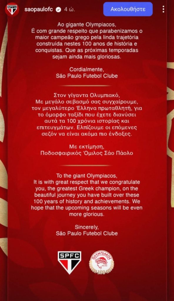«Στον γίγαντα Ολυμπιακό. Με μεγάλο σεβασμό σας συγχαίρουμε, τον μεγαλύτερο Έλληνα πρωταθλητή, για το όμορφο ταξίδι που έχετε διανύσει αυτά τα 100 χρόνια ιστορίας και επιτευγμάτων. Ελπίζουμε οι επόμενες σεζόν να είναι ακόμα πιο ένδοξες. Με εκτίμηση, Ποδοσφαιρικός Όμιλος Σάο Πάολο» αναφέρουν οι Βραζιλιάνοι στην ανάρτηση.