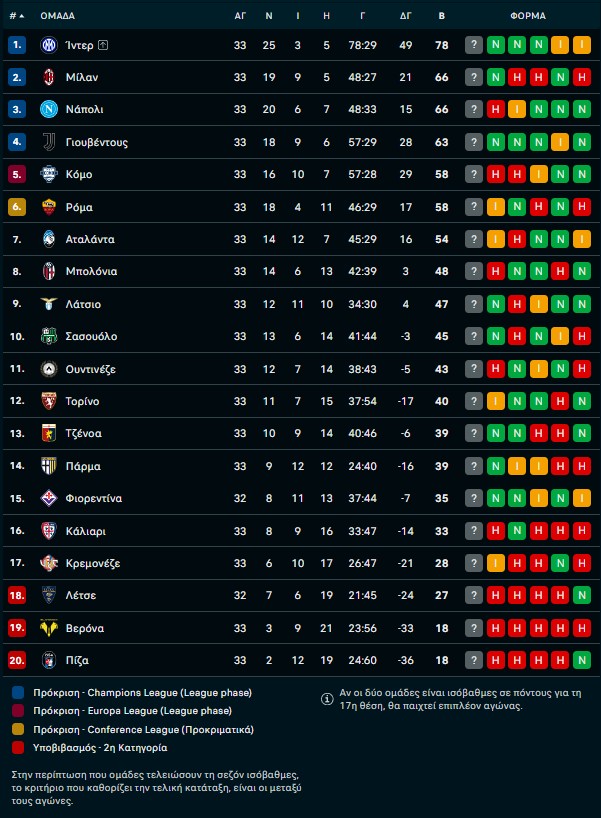 Την ίδια ώρα, η Τζένοα πέτυχε σπουδαία νίκη με 1-2 στην έδρα της Πίζα, ολοκληρώνοντας ανατροπή που αποδείχθηκε καθοριστική για την παραμονή της. Παρά τις σημαντικές απουσίες (Μαλινόφσκι, Φρέντρουπ, Έλερτσον), η ομάδα του Ντε Ρόσι βρήκε λύσεις, με τον Έκατορ να σκοράρει από ασίστ του Κολόμπο και τον ίδιο να βρίσκει δίχτυα στη συνέχεια, «σφραγίζοντας» το αποτέλεσμα.