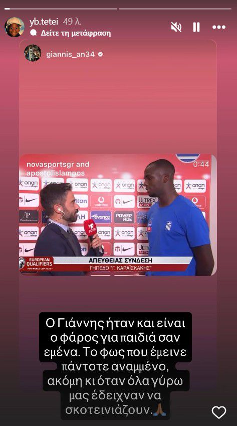 Με λόγια που πηγάζουν από την καρδιά, ο Ανδρέας Τεττέη εξέφρασε τον θαυμασμό του για τον Γιάννη Αντετοκούνμπο, χαρακτηρίζοντάς τον πρότυπο και πηγή έμπνευσης. Η αφορμή δόθηκε από τα πολλαπλά stories που δημοσίευσε ο αστέρας του NBA για τον ποδοσφαιριστή της Κηφισιάς.