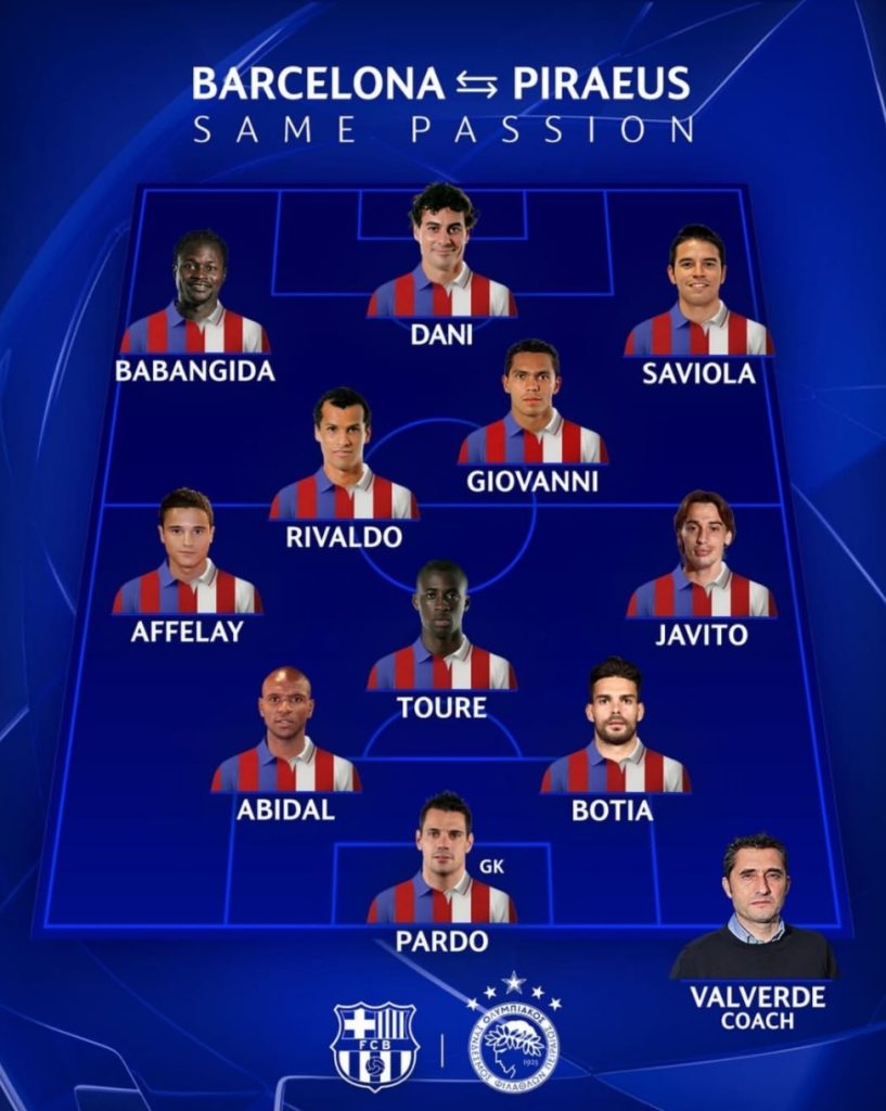 Το δρομολόγιο Μπαρτσελόνα – Ολυμπιακός: Μια ενδεκάδα με παίκτες που έπαιξαν και στους δύο 21/10/2025 Ο Ολυμπιακός έκανε μία ξεχωριστή ανάρτηση στο Instagram του πριν το ματς κόντρα στην Μπαρτσελόνα με 11 παίκτες με θητεία και στις δύο ομάδες. Προπονητής είναι ο Βαλβέρδε, πορτιέρε ο Πάρντο, στην άμυνα οι Αμπιντάλ και Μποτία και μπροστά τους ο Γιάγια Τουρέ. Στα δύο άκρα και πίσω από τους Ριβάλντο – Τζιοβάνι τοποθετήθηκαν οι Αφελάι και Χαβίτο και η τριάδα μπροστά είναι οι Μπαμπαγκίντα, Ντάνι και Σαβιόλα. ΔΙΑΒΑΣΤΕ ΕΠΙΣΗΣ