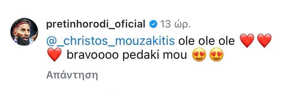 Το επικό σχόλιο του Ροντινέι στα ελληνικά στον Μουζακίτη! (ΦΩΤΟ) 06/02/2025 Την πρόκριση στα ημιτελικά πήρε ο Ολυμπιακός επικρατώντας με 1-0 του Παναθηναϊκού χάρη στο γκολ του Χρήστου Μουζακίτη. Ο πιτσιρικάς άσος των Πειραιωτών μετά την χθεσινή νίκη πόσταρε στα social media κάποιες φωτογραφίες με πανηγυρισμούς, με τον… συνήθη ύποπτο Ροντινέι να σχολιάζει από κάτω. «Μπράβο παιδάκι μου», έγραψε ο Βραζιλιάνος, με το σχόλιο να μαζεύει χιλιάδες likes! ΔΙΑΒΑΣΤΕ ΕΠΙΣΗΣ