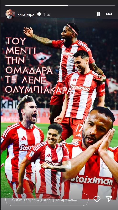 Ο εκ των αντιπρόεδρων των ερυθρόλευκων έγραψε στο instagram: «Του Μέντι την ομαδάρα, τη λένε Ολυμπιακάρα», παραφράζοντας το περίφημο από τη δεκαετία του ’60, «του Μπούκοβι την ομαδάρα, τη λένε Ολυμπιακάρα».
