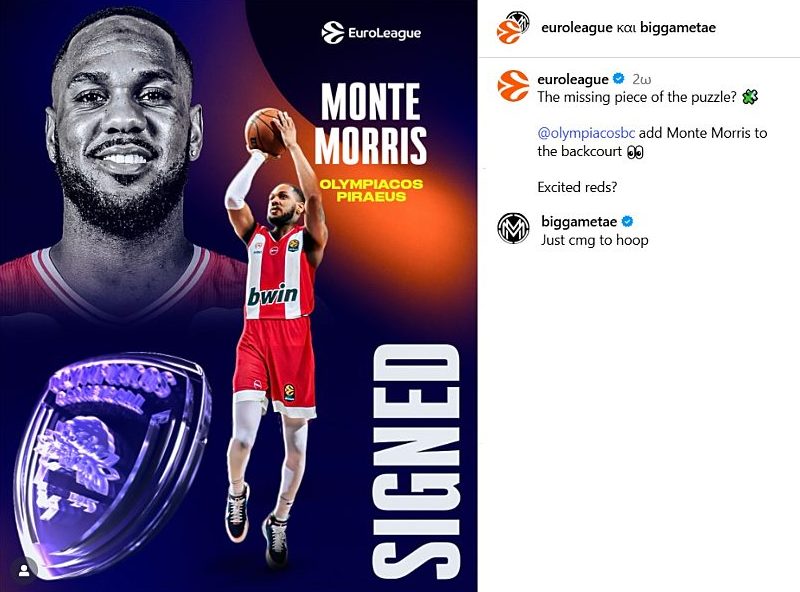 Το πρώτο μήνυμα του Μόντε Μόρις μετά την ανακοίνωση του Ολυμπιακού (ΦΩΤΟ) 11/12/2025 Ο Μόντε Μόρις έκανε αισθητή την παρουσία του αμέσως μετά την ανακοίνωση της συνεργασίας του με τον Ολυμπιακό, στέλνοντας το πρώτο του μήνυμα μέσω των social media. Ο Αμερικανός γκαρντ υπέγραψε συμβόλαιο έως το τέλος της σεζόν και εντάσσεται άμεσα στο ρόστερ των «ερυθρόλευκων». Ο 30χρονος διαθέτει σημαντική διαδρομή στο ΝΒΑ, έχοντας αγωνιστεί από το 2017 σε Ντάλας, Ουάσινγκτον, Ντιτρόιτ και Μινεσότα, ενώ τη φετινή σεζόν ξεκίνησε ως μέλος των Πέισερς, μετρώντας έξι συμμετοχές πριν μείνει ελεύθερος στις 20 Νοεμβρίου. Με αφορμή το ποστάρισμα της EuroLeague, η οποία αναρωτήθηκε αν ο Μόρις είναι το «κομμάτι που έλειπε από το παζλ» του Ολυμπιακού, ο νέος περιφερειακός της ομάδας απάντησε με τη φράση «Just cmg to hoop», δείχνοντας τη διάθεσή του να μπει άμεσα στη δράση και να βοηθήσει την ομάδα του Γιώργου Μπαρτζώκα. Δείτε το σχόλιό του: ΔΙΑΒΑΣΤΕ ΕΠΙΣΗΣ