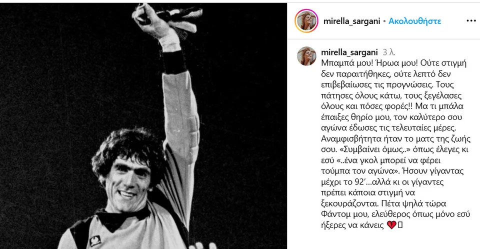 Με ένα πολύ συγκινητικό μήνυμα η Μιρέλλα Σαργκάνη αποχαιρέτησε τον πατέρα της, Νίκο. Ο θρυλικός τερματοφύλακας έφυγε από τη ζωή τα ξημερώματα σε ηλικία 70 ετών.