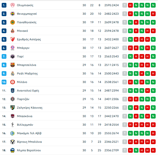Βαθμολογία Euroleague: Παρέμεινε μόνος τρίτος με ρεκόρ 19-11 και πλησιάζει στο πλεονέκτημα έδρας ο Παναθηναϊκός! 21/03/2025 Στο κυνήγι της δεύτερης θέσης έμεινε ο Παναθηναϊκός με την εντός έδρας νίκη του επί της Άλμπα Βερολίνου (91-81) για την 30η αγωνιστική της EuroLeague. Με τη νίκη αυτή, οι «πράσινοι» βελτίωσαν το ρεκόρ τους στο 19-11, έμειναν μόνοι στην τρίτη θέση και… αγκάλιασαν το πλεονέκτημα έδρας ενόψει των playoffs, τέσσερις αγωνιστικές πριν το φινάλε της κανονικής περιόδου. Αποτελέσματα/πρόγραμμα 30ης αγωνιστικής Τρίτη 18/03 Παρί – Αρμάνι Μιλάνο 92-79 Πέμπτη 20/03 Ολυμπιακός – Ερυθρός Αστέρας 73-81 Μονακό – Φενέρμπαχτσε 91-82 Μακάμπι Τελ Αβίβ – Βίρτους Μπολόνια 77-67 Μπασκόνια – Μπάγερν Μονάχου 112-89 Ρεάλ Μαδρίτης – Βιλερμπάν 81-70 Παρασκευή 21/03 Παναθηναϊκός – Άλμπα Βερολίνου 91-81 Μπαρτσελόνα – Ζαλγκίρις Κάουνας 82-70 Παρτιζάν – Αναντολού Εφές 21:45 Η βαθμολογία: ΔΙΑΒΑΣΤΕ ΕΠΙΣΗΣ