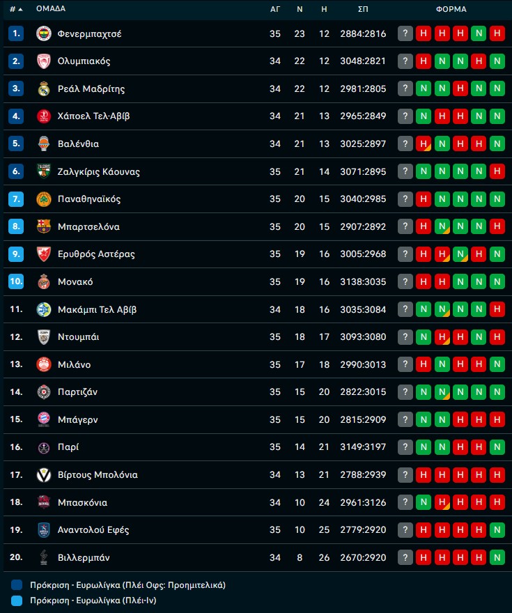 Βαθμολογία EuroLeague: Πίεση για τον Παναθηναϊκό μετά την ήττα από τη Χάποελ (ΦΩΤΟ) 03/04/2026 Ο Παναθηναϊκός δεν εκμεταλλεύτηκε τις συγκυρίες και γνώρισε την ήττα με 92-88 από τη Χάποελ Τελ Αβίβ στη Σόφια, για την 35η αγωνιστική της EuroLeague, χάνοντας σημαντικό έδαφος στη μάχη της εξάδας. Οι «πράσινοι» υποχώρησαν στο 20-15, την ώρα που η Χάποελ ανέβηκε στο 21-13 (με ματς λιγότερο) και απομακρύνθηκε, αφήνοντας την ομάδα του Εργκίν Αταμάν να κυνηγά πλέον μέχρι τέλους την απευθείας πρόκριση στα playoffs. Στα υπόλοιπα παιχνίδια, η Ζαλγκίρις νίκησε την Μπαρτσελόνα με 83-71, ενώ η Παρτιζάν πήρε το ντέρμπι του Βελιγραδίου με 89-82 απέναντι στον Ερυθρό Αστέρα, βάζοντας ακόμη μεγαλύτερη πίεση στη μάχη της εξάδας. H Ντουμπάι BC νίκησε τη Μονακό με 101-91 και μπήκε δυναμικά στη διεκδίκηση της δεκάδας, ενώ η Παρί επικράτησε με 103-93 της Αρμάνι Μιλάνο, αφήνοντας τους Ιταλούς ουσιαστικά εκτός συνέχειας. Εντυπωσιακή ήταν και η Μακάμπι Τελ Αβίβ, που επικράτησε με 103-89 της Αναντολού Εφές, σε ένα αποτέλεσμα που διατηρεί ανοιχτές ισορροπίες στη βαθμολογία. Το πρόγραμμα της αγωνιστικής ολοκληρώνεται με τις αναμετρήσεις Βιλερμπάν – Ολυμπιακός, Βίρτους Μπολόνια – Βαλένθια και Μπασκόνια – Ρεάλ Μαδρίτης. Πλέον, το πρόγραμμα που ακολουθεί για τον Παναθηναϊκό είναι ιδιαίτερα απαιτητικό, με εκτός έδρας δοκιμασίες απέναντι σε Μπαρτσελόνα και Βαλένθια, πριν το φινάλε στο ΟΑΚΑ με την Αναντολού Εφές, σε μια μάχη που θα κριθεί στις λεπτομέρειες. Η 35η αγωνιστική της Euroleague: Μπάγερν Μονάχου – Φενέρμπαχτσε 85-76 Ζαλγκίρις – Μπαρτσελόνα 83-71 Χάποελ – Παναθηναϊκός 92-88 Ντουμπάι BC – Μονακό 101-91 Ερυθρός Αστέρας – Παρτιζάν 84-89 Παρί – Αρμάνι Μιλάνο 103-93 Μακάμπι Τελ Αβίβ – Αναντολού Εφές 103-89 Βιλερμπάν – Ολυμπιακός (3/4, 21:00) Βίρτους Μπολόνια – Βαλένθια (3/4, 21:30) Μπασκόνια – Ρεάλ Μαδρίτης (3/4, 21:30) Η βαθμολογία: ΔΙΑΒΑΣΤΕ ΕΠΙΣΗΣ