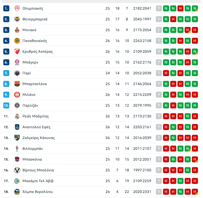 Βαθμολογία Euroleague: Σταθερά σε τροχιά πλεονεκτήματος έδρας ο Παναθηναϊκός 06/02/2025 Ο Παναθηναϊκός ξεπέρασε με εκατοστάρα το εμπόδιο της Αναντολού Εφές και έκανε το 2/2 στη διαβολοβδομάδα της Euroleague, ανεβαίνοντας έτσι στο 16-10. Με τον τρόπο αυτό, ο Επτάστερος διατηρήθηκε σε τροχιά πλεονεκτήματος έδρας, όντας πίσω μόνο από Ολυμπιακό, Φενέρμπαχτσε και Μονακό, με την οποία έχει πλέον ισάριθμες νίκες, με ματς περισσότερο. Μαζί με το «τριφύλλι» βρίσκεται και ο Ερυθρός Αστέρας, που πέρασε από το Βερολίνο. Η Ρεάλ Μαδρίτης υποχώρησε εκτός δεκάδας μετά τη βαριά της ήττα στην Κωνσταντινούπολη. Το πρόγραμμα της 26ης αγωνιστικής Πέμπτη (06/02) Φενέρμπαχτσε-Ρεάλ Μαδρίτης 78-67 Ζαλγκίρις Κάουνας-Αρμάνι Μιλάνο 87-89 Άλμπα Βερολίνου-Ερυθρός Αστέρας 71-77 Παναθηναϊκός-Αναντολού Εφές 104-89 Μπάγερν Μονάχου-Βιλερμπάν Παρασκευή (07/02) Μονακό-Παρτιζάν (20:00) Βίρτους Μπολόνια-Παρί (21:30) Μπαρτσελόνα-Ολυμπιακός (21:30) Μπασκόνια-Μακάμπι Τελ Αβίβ (21:30) Η βαθμολογία ΔΙΑΒΑΣΤΕ ΕΠΙΣΗΣ