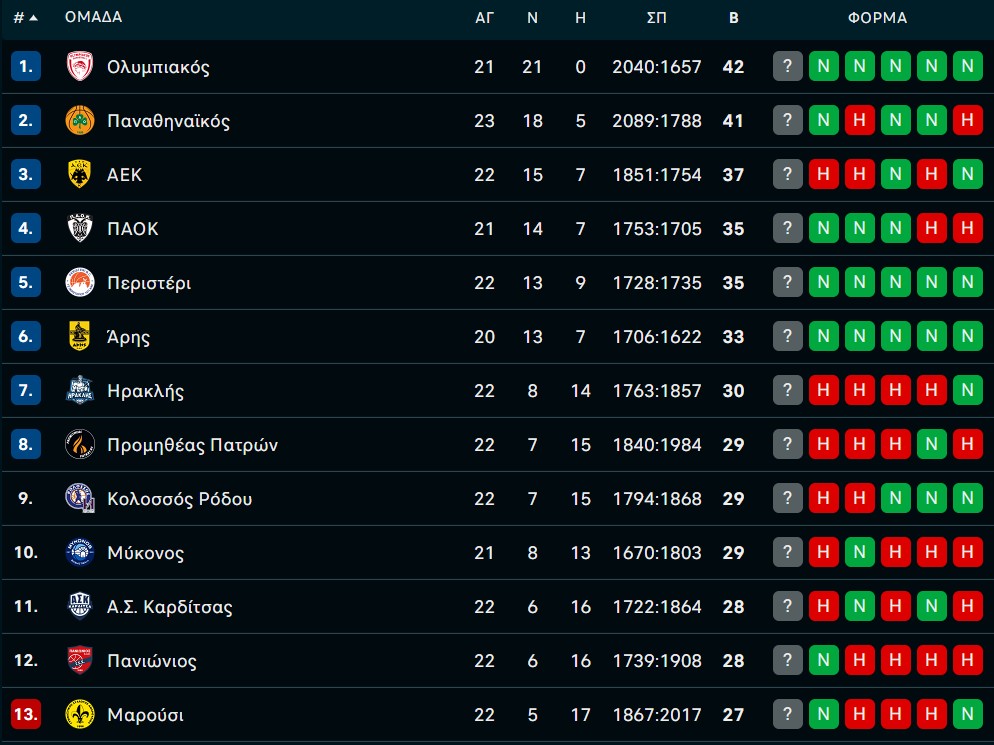Βαθμολογία GBL: Μάχη μέχρι τέλους για τετράδα και σωτηρία (ΦΩΤΟ) 04/04/2026 Σημαντικές εξελίξεις έφερε η πρώτη μέρα της 24ης αγωνιστικής στη GBL, με τον Πανιώνιο να κάνει καθοριστικό βήμα για την παραμονή και τη μάχη της τετράδας να κορυφώνεται. Ο Παναθηναϊκός επέστρεψε στις νίκες με εμφατικό τρόπο, περνώντας από την Πάτρα, ενώ ο Πανιώνιος πήρε πολύτιμη νίκη και απομακρύνθηκε από την τελευταία θέση, στην οποία βρίσκεται το Μαρούσι, διατηρώντας ζωντανές τις ελπίδες του για παραμονή. Την ίδια ώρα, ΠΑΟΚ, Άρης και Περιστέρι συνέχισαν με νίκες, διατηρώντας αμείωτο τον ανταγωνισμό για μία θέση στην τετράδα, σε μία «μάχη» που αναμένεται να κριθεί μέχρι το τέλος. Το πρόγραμμα της 24ης αγωνιστικής ολοκληρώνεται με την αυριανή αναμέτρηση του Ολυμπιακού απέναντι στη Μύκονο (5/4, 13:00). Τα αποτελέσματα και το πρόγραμμα της 24ης αγωνιστικής Πανιώνιος – Ηρακλής 103-77 Περιστέρι – Κολοσσός 87-83 Άρης – ΑΕΚ 82-78 Προμηθέας – Παναθηναϊκός 63-96 ΠΑΟΚ – Καρδίτσα 93-90 Ολυμπιακός – Μύκονος (5/4, 13:00) Ρεπό: Μαρούσι Η βαθμολογία: Το πρόγραμμα της 25ης αγωνιστικής Μύκονος – Περιστέρι (18/4, 16:00) Μαρούσι – Κολοσσός (18/4, 16:00) Καρδίτσα – Προμηθέας (18/4, 18:15) Ηρακλής – ΠΑΟΚ (18/4, 18:15) Ολυμπιακός – Άρης (19/4, 13:00) Πανιώνιος – ΑΕΚ (19/4, 16:00) Ρεπό: Παναθηναϊκός ΔΙΑΒΑΣΤΕ ΕΠΙΣΗΣ