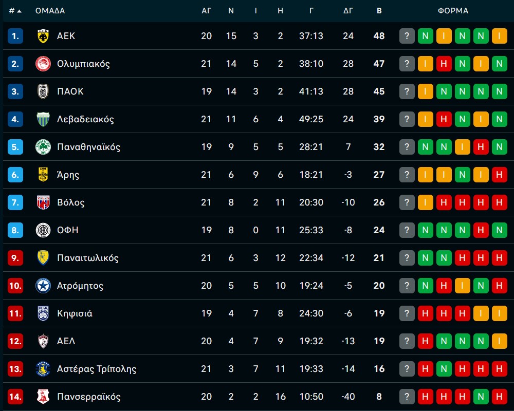 Βαθμολογία Super League: Φουντώνει η μάχη του τίτλου μετά την γκέλα του Ολυμπιακού στη Λιβαδειά (ΦΩΤΟ) 14/02/2026 Η «λευκή» ισοπαλία στη Λιβαδειά κόστισε στον Ολυμπιακό, που ανέβηκε μεν στους 47 βαθμούς, αλλά βρίσκεται πλέον στο -1 από την πρωτοπόρο ΑΕΚ και με παιχνίδι περισσότερο. Στους 45 βαθμούς ακολουθεί ο ΠΑΟΚ, έχοντας δύο ματς λιγότερα, γεγονός που κρατά απόλυτα ανοιχτή τη μάχη της κορυφής. Οι «ερυθρόλευκοι» περιμένουν πλέον το αποτέλεσμα του αυριανού ΠΑΟΚ–ΑΕΚ για να ξεκαθαρίσει το τοπίο. Την ίδια ώρα ο Άρης κόλλησε στον Βόλο και με το τελικό 1-1 έχασε μεγάλη ευκαιρία να ξεφύγει από τους Θεσσαλούς και να κυνηγήσει την 5η θέση. Νωρίτερα, ο Παναιτωλικός επικράτησε 3-1 του Αστέρα Τρίπολης σε ένα πολύ κρίσιμο ματς για την παραμονή στην κατηγορία. Η 21η αγωνιστική: Σάββατο 14 Φεβρουαρίου Παναιτωλικός – Αστέρας Τρίπολης 3-1 Λεβαδειακός – Ολυμπιακός 0-0 Βόλος – Άρης 1-1 Κυριακή 15 Φεβρουαρίου 17:30 Κηφισιά – ΟΦΗ 19:30 ΠΑΟΚ – ΑΕΚ 21:00 Παναθηναϊκός – ΑΕΛ Δευτέρα 16 Φεβρουαρίου 18:00 Ατρόμητος – Πανσερραϊκός Η βαθμολογία: ΔΙΑΒΑΣΤΕ ΕΠΙΣΗΣ