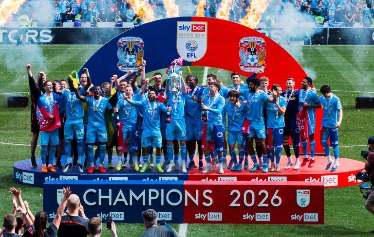 Μετά το σφύριγμα της λήξης, παίκτες και κόσμος έγιναν ένα, με τους «Sky Blues» να σηκώνουν την κούπα και να γιορτάζουν την επιστροφή τους στην Premier League, στην οποία θα αγωνιστούν ξανά μετά από 25 χρόνια.