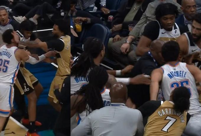 ΒΙΝΤΕΟ: Έπεσε ξύλο στο Ουίζαρντς-Θάντερ! 22/03/2026 Άναψαν τα αίματα στην αναμέτρηση των Ουάσινγκτον Ουίζαρντς με τους Οκλαχόμα Σίτι Θάντερ, λίγο πριν την λήξη του ημιχρόνου. Με 27” να απομένουν στο χρονόμετρο για το τέλος της δεύτερης περιόδου, μια λογομαχία πριν την επαναφορά της μπάλας έφερε… μπουνιές και σπρωξίματα, με τους διαιτητές να έχουν αρκετή δουλειά! Μόλις ηρέμησε η κατάσταση, η διαιτητική τριάδα εξέτασε το συμβάν στο βίντεο και αποφάσισε να αποβάλει τους Ατζάι Μίτσελ, Τζέιλιν Ουίλιαμς και Κέισον Ουάλας από την πλευρά των Θάντερ και τον Τζάστιν Σαμπάνιε από τους Ουίζαρντς. ΔΙΑΒΑΣΤΕ ΕΠΙΣΗΣ