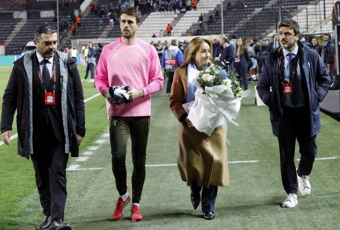 Το υψηλόβαθμο στέλεχος της ισπανικής ομάδας παρακολούθησε από κοντά την αναμέτρηση απέναντι στον Δικέφαλο του Βορρά, καταθέτοντας λουλούδια στη Θύρα 4 πριν από τη σέντρα του παιχνιδιού, στη μνήμη των «αετόπουλων».