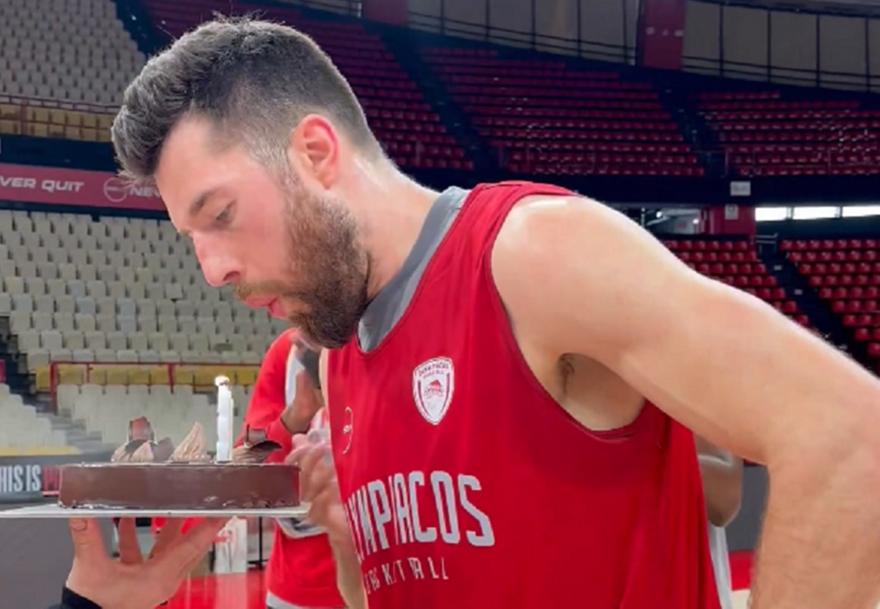 Η απαραίτητη για την περίσταση τούρτα έκανε την εμφάνισή της στο παρκέ του ΣΕΦ, όλοι ευχήθηκαν στον Αμερικανό φόργουορντ και αυτός έσβησε το κεράκι για τα 31 χρόνια ζωής που συμπληρώνει.