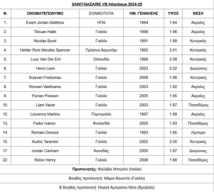 Βόλεϊ: Η αντίπαλος του Ολυμπιακού στα playoffs του Champions League 30/01/2025 Για πρώτη φορά την φετινή σεζόν ο Ολυμπιακός θα βρεθεί αντιμέτωπος με γαλλική ομάδα στο Champions League βόλεϊ και αυτό γιατί η Σεντ Ναζέρ είναι η ομάδα που θα πρέπει να αποκλείσουν οι ερυθρόλευκοι στα playoffs της κορυφαίας διασυλλογικής διοργάνωσης. Το ρόστερ της περιλαμβάνει έξι ξένους και πέντε διεθνείς Γάλλους. Κατέκτησε τον τίτλο της Ligue A την περσινή σεζόν, αλλά φέτος δεν πηγαίνει καλά, καθώς είναι στην 11η θέση μεταξύ 13 ομάδων με 16 βαθμούς σε 17 αγώνες και απολογισμό έξι νίκες και 11 ήττες. Προκρίθηκε στα playoffs του Champions League βόλεϊ από τον Δ’ όμιλο ως καλύτερη 3η, πίσω από την Περούτζια και την Χάλκμπανκ Άγκυρας. Η βασική σύνθεσή της είναι συνήθως ο Αμερικανός Μάθιου και ο Πορτογάλος Μαρτίνς ως ακραίοι, διαγώνιος ο Λεόν, πασαδόρος ο Φινλανδός Ιβάνοφ και κεντρικοί ο Μπάρελ και ο Ολλανδός Βαν Ντερ Εντ, ενώ την θέση του λίμπερο καλύπτει ο Ντιβίζ. Το πρώτο παιχνίδι του Ολυμπιακού με την Σεντ Ναζέρ θα διεξαχθεί επί γαλλικού εδάφους στις 11, 12 ή 13 Φεβρουαρίου και η ρεβάνς θα λάβει χώρα στο κλειστό “Μελίνα Μερκούρη” στις 25, 26 ή 27 του ίδιου μήνα. Αναλυτικά το ρόστερ της: ΔΙΑΒΑΣΤΕ ΕΠΙΣΗΣ